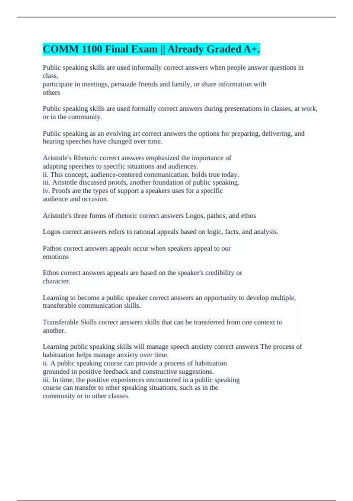 Public speaking skills are used informally correct answers when people answer questions in class, participate in meetings, persuade friends and family, or share information with others Public speaking skills are used formally correct answers during presentations in classes, at work, or in the community. Public speaking as an evolving art correct answers the options for preparing, delivering, and hearing speeches have changed over time. Aristotle's Rhetoric correct answers emphasized the importance of adapting speeches to specific situations and audiences. ii. This concept, audience-centered communication, holds true today. iii. Aristotle discussed proofs, another foundation of public speaking. iv. Proofs are the types of support a speakers uses for a specific audience and occasion. Aristotle's three forms of rhetoric correct answers Logos, pathos, and ethos Logos correct answers refers to rational appeals based on logic, facts, and analysis. Pathos correct answers appeals occur when speakers appeal to our emotions Ethos correct answers appeals are based on the speaker's credibility or character. Learning to become a public speaker correct answers an opportunity to develop multiple, transferable communication skills. Transferable Skills correct answers skills that can be transferred from one context to another. Learning public speaking skills will manage speech anxiety correct answers The process of habituation helps manage anxiety over time. ii. A public speaking course can provide a process of habituation grounded in positive feedback and constructive suggestions. iii. In time, the positive experiences encountered in a public speaking course can transfer to other speaking situations, such as in the community or to other classes.