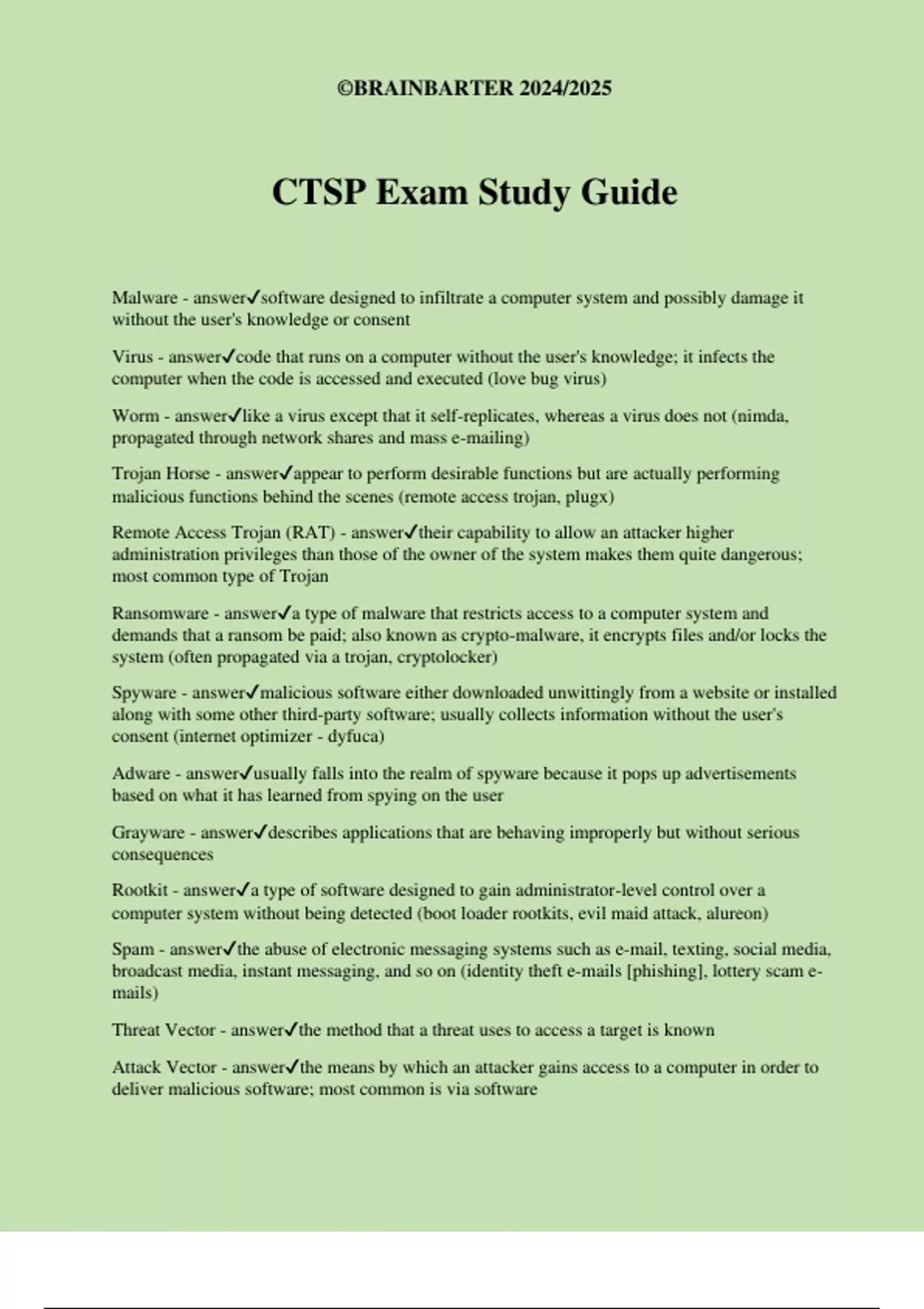 ©BRAINBARTER 2024/2025 CTSP Exam Study Guide Malware - answersoftware designed to infiltrate a computer system and possibly damage it without the user's knowledge or consent Virus - answercode that runs on a computer without the user's knowledge; it infects the computer when the code is accessed and executed (love bug virus) Worm - answerlike a virus except that it self-replicates, whereas a virus does not (nimda, propagated through network shares and mass e-mailing) Trojan Horse - answerappear to perform desirable functions but are actually performing malicious functions behind the scenes (remote access trojan, plugx) Remote Access Trojan (RAT) - answertheir capability to allow an attacker higher administration privileges than those of the owner of the system makes them quite dangerous; most common type of Trojan Ransomware - answera type of malware that restricts access to a computer system and demands that a ransom be paid; also known as crypto-malware, it encrypts files and/or locks the system (often propagated via a trojan, cryptolocker) Spyware - answermalicious software either downloaded unwittingly from a website or installed along with some other third-party software; usually collects information without the user's consent (internet optimizer - dyfuca) Adware - answerusually falls into the realm of spyware because it pops up advertisements based on what it has learned from spying on the user Grayware - answerdescribes applications that are behaving improperly but without serious consequences Rootkit - answera type of software designed to gain administrator-level control over a computer system without being detected (boot loader rootkits, evil maid attack, alureon) Spam - answerthe abuse of electronic messaging systems such as e-mail, texting, social media, broadcast media, instant messaging, and so on (identity theft e-mails [phishing], lottery scam e- mails) Threat Vector - answerthe method that a threat uses to access a target is known Attack Vector - answerthe means by which an attacker gains access to a computer in order to deliver malicious software; most commo