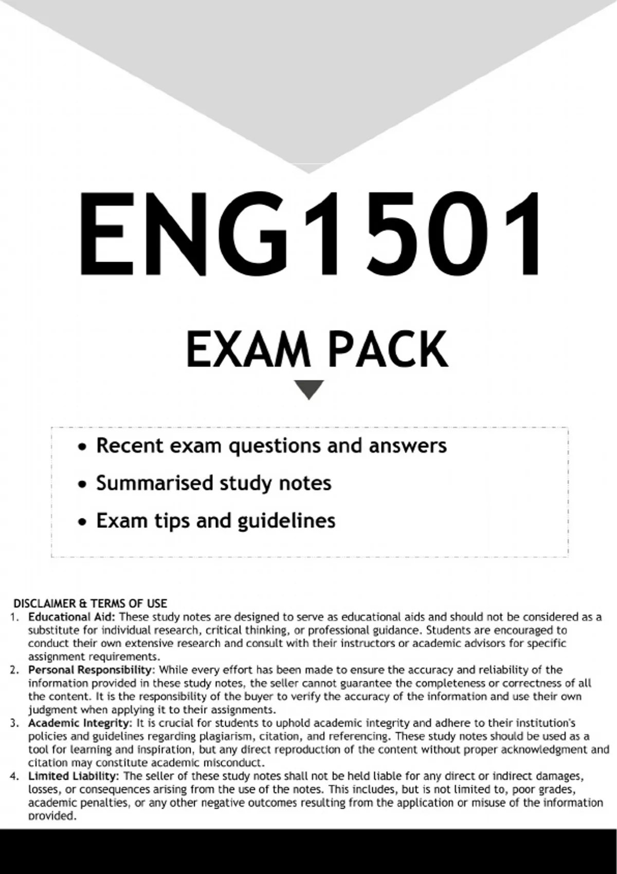 Well-structured ENG1501 EXAM PREPARATION PACK - DISTINCTION GUARANTEED. Contains recent exam questions and answers, and Summarised study notes. All you need to pass the 2026 EXAMS