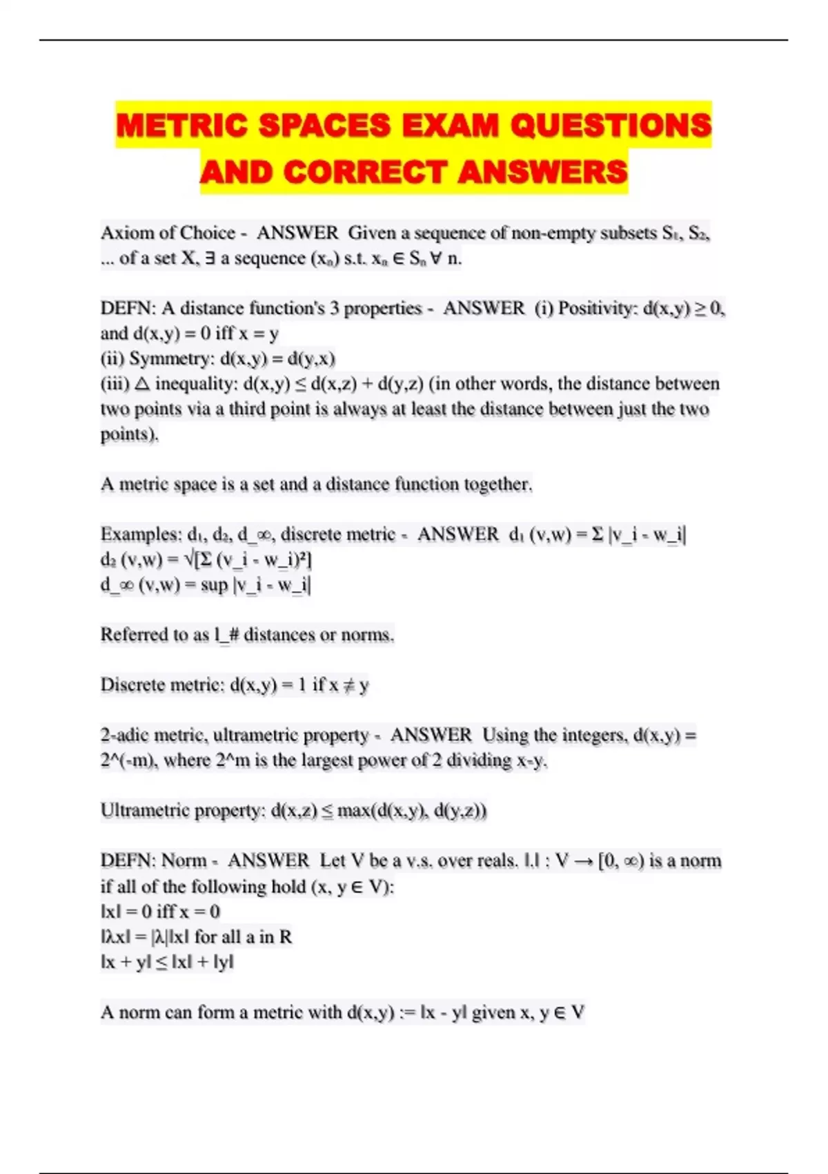 Examples: d₁, d₂, d_∞, discrete metric - ANSWER d₁ (v,w) = Σ |v_i - w_i|