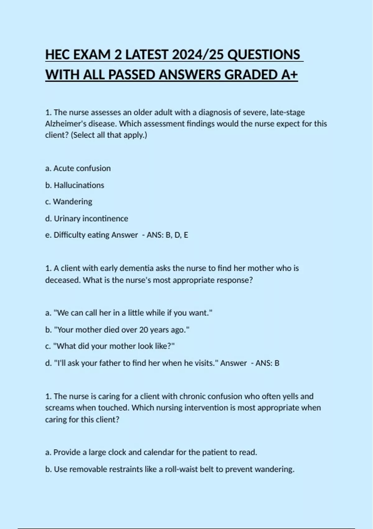 1. The nurse assesses an older adult with a diagnosis of severe, late-stage