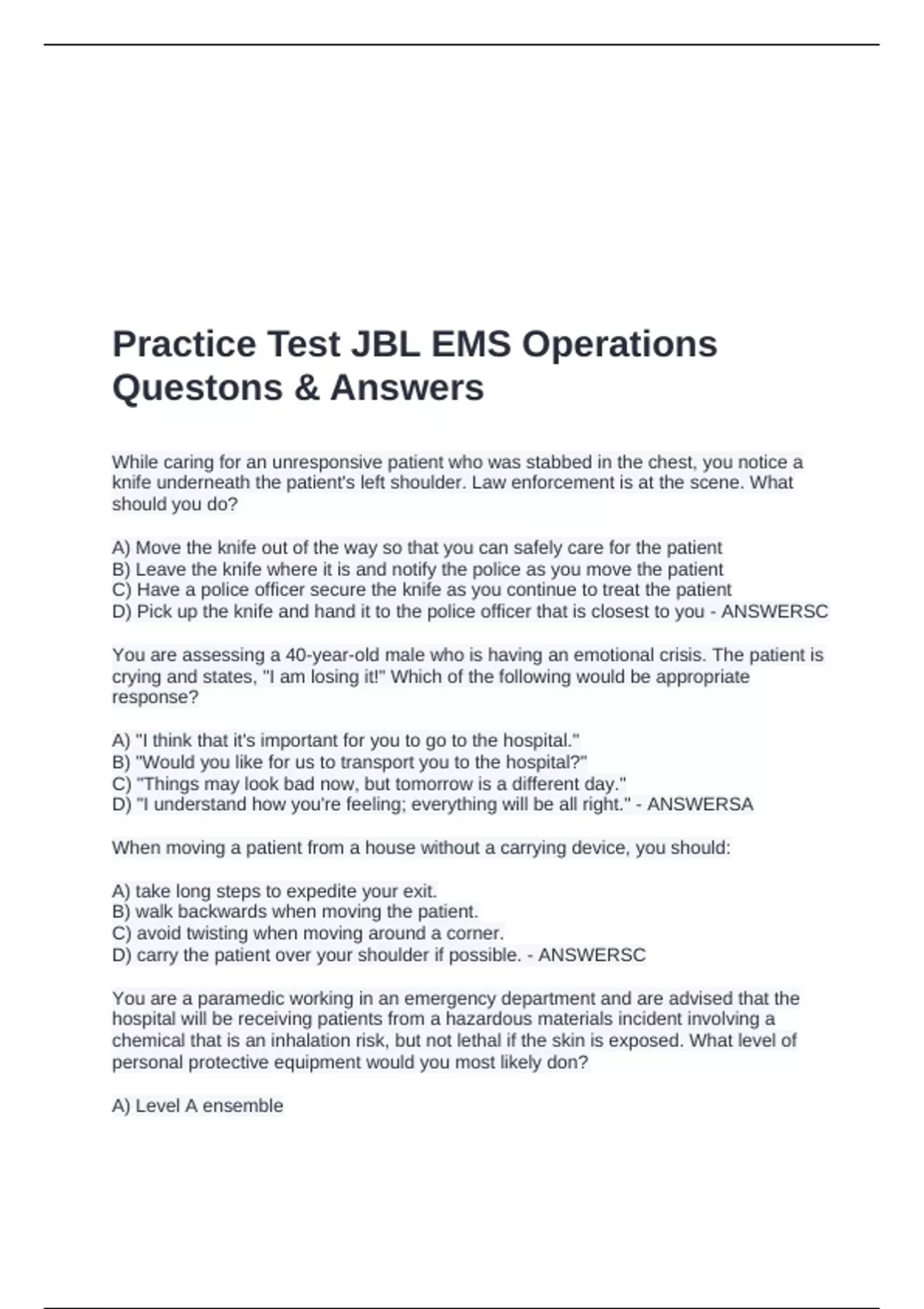While caring for an unresponsive patient who was stabbed in the chest, you notice a knife underneath the patient's left shoulder. Law enforcement is at the scene. What should you do? A) Move the knife out of the way so that you can safely care for the patient B) Leave the knife where it is and notify the police as you move the patient C) Have a police officer secure the knife as you continue to treat the patient D) Pick up the knife and hand it to the police officer that is closest to you - ANSWERSC You are assessing a 40-year-old male who is having an emotional crisis. The patient is crying and states, "I am losing it!" Which of the following would be appropriate response? A) "I think that it's important for you to go to the hospital." B) "Would you like for us to transport you to the hospital?" C) "Things may look bad now, but tomorrow is a different day." D) "I understand how you're feeling; everything will be all right." - ANSWERSA When moving a patient from a house without a carrying device, you should: A) take long steps to expedite your exit. B) walk backwards when moving the patient. C) avoid twisting when moving around a corner. D) carry the patient over your shoulder if possible. - ANSWERSC You are a paramedic working in an emergency department and are advised that the hospital will be receiving patients from a hazardous materials incident involving a chemical that is an inhalation risk, but not lethal if the skin is exposed. What level of personal protective equipment would you most likely don? A) Level A ensemble B) Level B ensemble C) Level C ensemble D) Level D ensemble - ANSWERSC Upon returning to your station following a call in which an infant was killed in a motor vehicle crash, your partner immediately goes into his dorm room, closes the door, and begins to cry. He will not let you open the door and tells that he just needs some time to himself. What should you do? A) Tell him that you understand how he is feeling B) Tell him that talking about it will help him cope C) Arrange a critical incident stress debriefing for him D) Comply with his request and notify your supervisor - ANSWERSD During a mass-casualty incident, what officer is responsible for ascertaining the capabilities of area hospitals? A) Staging B) Support C) Triage D) Transport - ANSWERSD According to the Sort, Assess, Life-saving interventions, and Treatment and/or Transport (SALT) triage system, how should patients who are unable to walk initially be managed? A) Conduct a rapid head-to-toe assessment on each patient and initiate treatment B) Observe them for purposeful movement or the ability to follow verbal commands C) Assign them as deceased and come back to them after triaging the other patients D) Quickly move them to a separate area and triage the more critically injured patients - ANSWERSB At the scene of a violent crime, a man has been decapitated with an axe. What should you do? A) Apply a cardiac monitor to verify asystole B) Avoid touching the body if at all possible C) Quickly assess the body for other injuries D) Contact the patient's immediate family - ANSWERSB Which of the following is the MOST effective way to minimize the risk of any one rescuer suddenly bearing unexpected, dangerous weight while lifting a patient? A) Ensure that each rescuer involved in the lift is capable of lifting the equivalent of two times their individual body weight B) Routinely place at least two rescuers at the foot of the stretcher or carrying device since this is the heaviest part of the patient C) Know where rescuers should be positioned as well as how to give and receive commands so that all rescuers lift simultaneously D) Utilize a minimum of four rescuers when lifting any patient, regardless of the patient's weight or the type of carrying device being utilized - ANSWERSC What level of technical rescue training is limited to recognizing hazards, securing the scene, and calling for appropriate resources? A) Operations B) Awareness C) Technician D) Command - ANSWERSB Which of the following is the MOST practical and reliable way of ensuring that all pertinent times regarding an EMS call are properly documented? A) Notify the dispatcher each time an event occurs B) Glance at your watch immediately after each event C) Ask your partner to document each event as it occurs D) Use law enforcement personnel to keep track of your times - ANSWERSA The paramedic fails to administer oxygen to a severely hypoxic patient. As a result, the patient develops respiratory arrest. The patient is delivered to the emergency department; however, the paramedics leave without providing a verbal hand-off report. Which of the following does this scenario depict? A) Assault and battery B) Assault and gross negligence C) Battery and abandonment D) Negligence and abandonment - ANSWERSD What type of research examines patterns of change, a sequence of events, or trends over time within a certain population of study subjects? A) Cohort B) Prospective C) Retrospective D) Literature review - ANSWERSA A patient who complains of abdominal pain informs you that she is HIV-positive. Which of the following is appropriate personal protective equipment? A) Gloves and safety glasses B) Gloves and a full face mask C) Gloves, gown, and a mask D) Gloves and a HEPA mask - ANSWERSA What type of ambulance features a conventional truck cab chassis with a modular body that can be transferred to a new chassis as needed? A) Type I B) Type II C) Type III D) Type IV - ANSWERSA