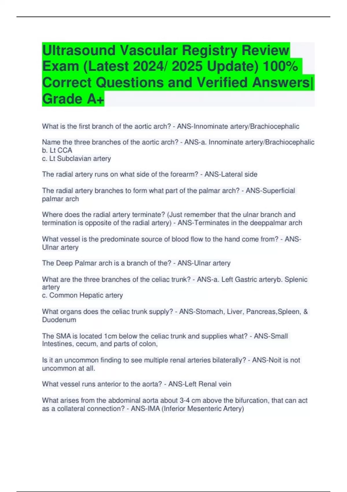 Ultrasound Vascular Registry Review Exam (Latest 2024/ 2025 Update) 100% Correct Questions and Verified Answers| Grade A+