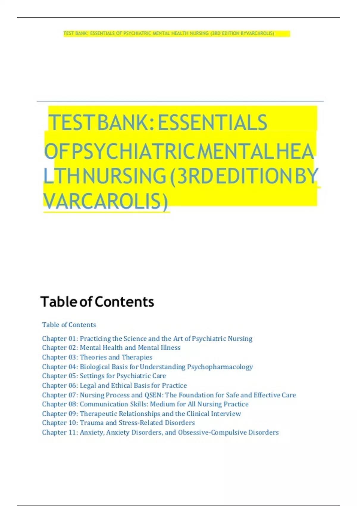 TEST BANK: ESSENTIALS OF PSYCHIATRIC MENTAL HEA LTH NURSING (3RDFEDITION BY VARCAROLIS)