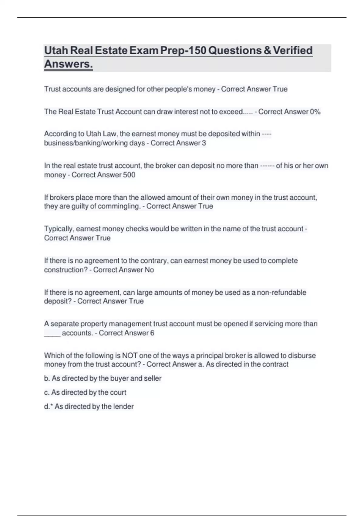 UtahRealEstateExamPrep-150Questions&Verified Answers. Trust accounts are designed for other people's money - Correct Answer True The Real Estate Trust Account can draw interest not to exceed..... - Correct Answer 0% According to Utah Law, the earnest money must be deposited within ---- business/banking/working days - Correct Answer 3 In the real estate trust account, the broker can deposit no more than ------ of his or her own money - Correct Answer 500 If brokers place more than the allowed amount of their ow