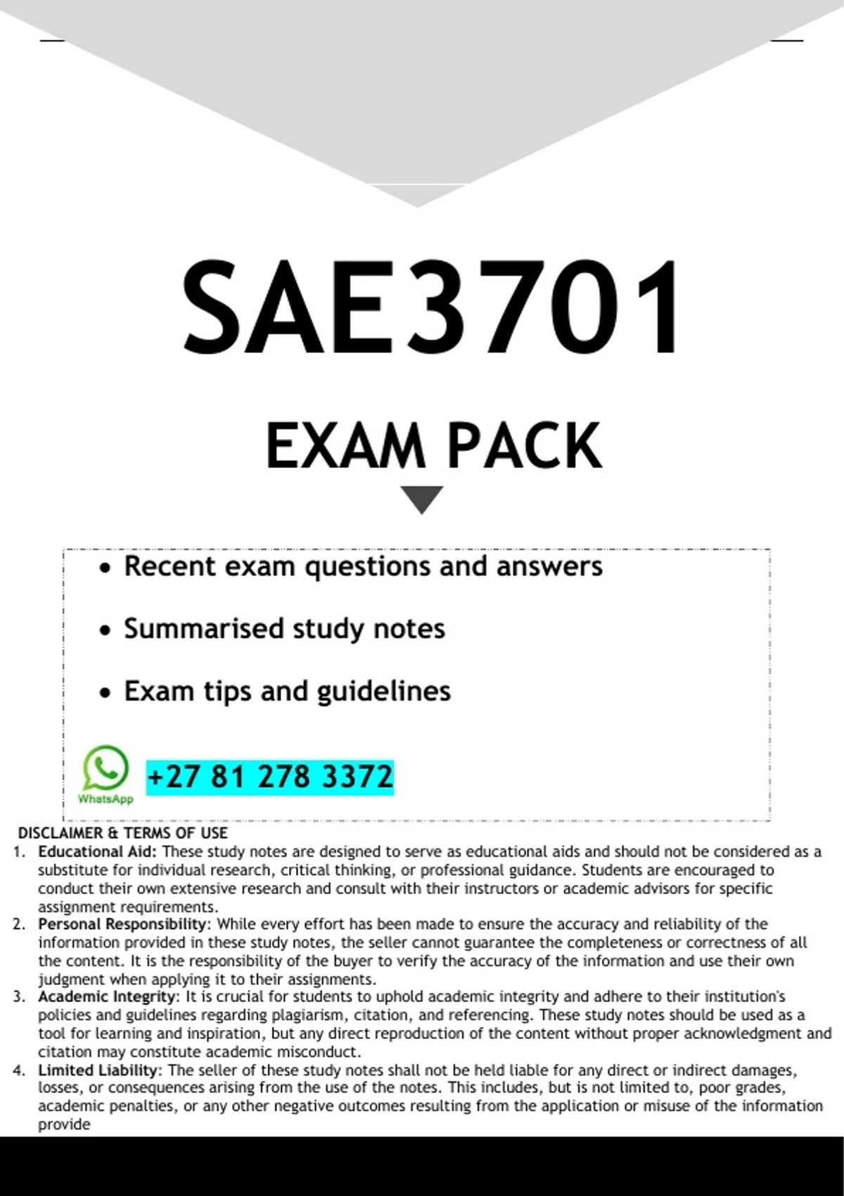 Well-structured SAE3701 EXAM PREPARATION PACK - DISTINCTION GUARANTEED. Contains recent exam questions and answers, and Summarised study notes. All you need to pass the 2026 EXAMS.