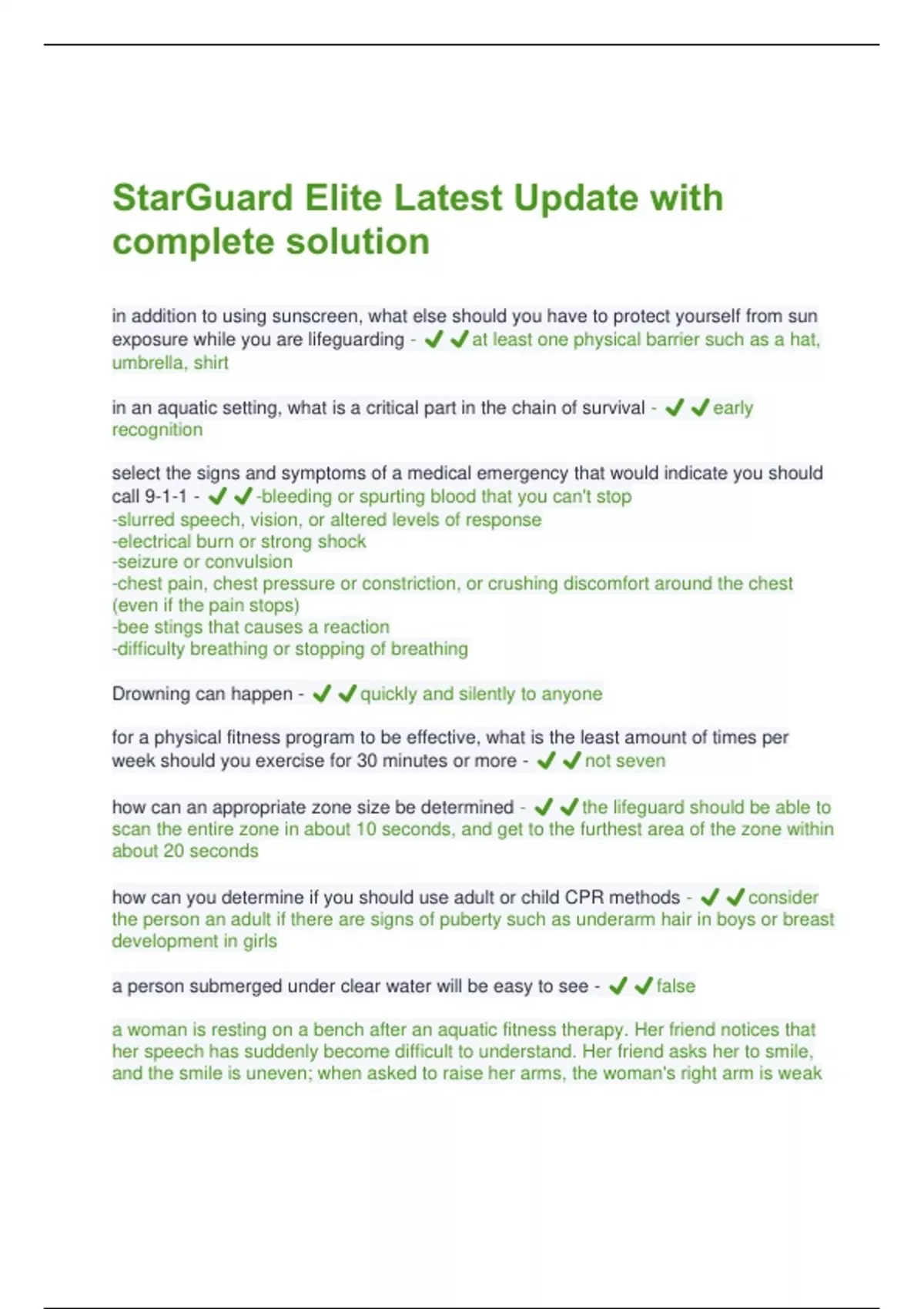 in addition to using sunscreen, what else should you have to protect yourself from sun exposure while you are lifeguarding - ️️at least one physical barrier such as a hat, umbrella, shirt in an aquatic setting, what is a critical part in the chain of survival - ️️early recognition select the signs and symptoms of a medical emergency that would indicate you should call 9-1-1 - ️️-bleeding or spurting blood that you can't stop -slurred speech, vision, or altered levels of response -electrical burn or strong shock -seizure or convulsion -chest pain, chest pressure or constriction, or crushing discomfort around the chest (even if the pain stops) -bee stings that causes a reaction -difficulty breathing or stopping of breathing Drowning can happen - ️️quickly and silently to anyone for a physical fitness program to be effective, what is the least amount of times per week should you exercise for 30 minutes or more - ️️not seven