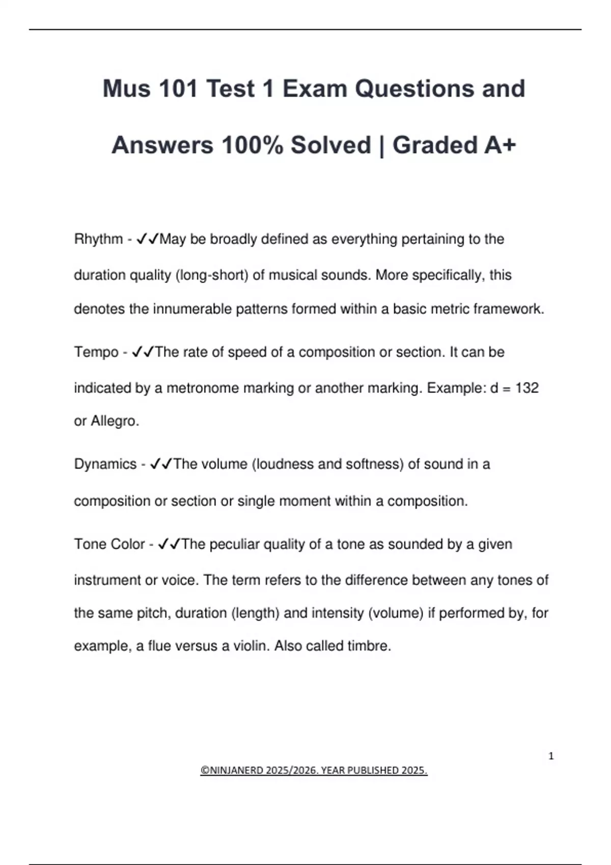 Mus 101 Test 1 Exam Questions and Answers 100% Solved | Graded A+ Rhythm - May be broadly defined as everything pertaining to the duration quality (long-short) of musical sounds. More specifically, this denotes the innumerable patterns formed within a basic metric framework. Tempo - The rate of speed of a composition or section. It can be indicated by a metronome marking or another marking. Example: d = 132 or Allegro. Dynamics - The volume (loudness and softness) of sound in a composition or section or single moment within a composition. Tone Color - The peculiar quality of a tone as sounded by a given instrument or voice. The term refers to the difference between any tones of the same pitch, duration (length) and intensity (volume) if performed by, for example, a flue versus a violin. Also called timbre