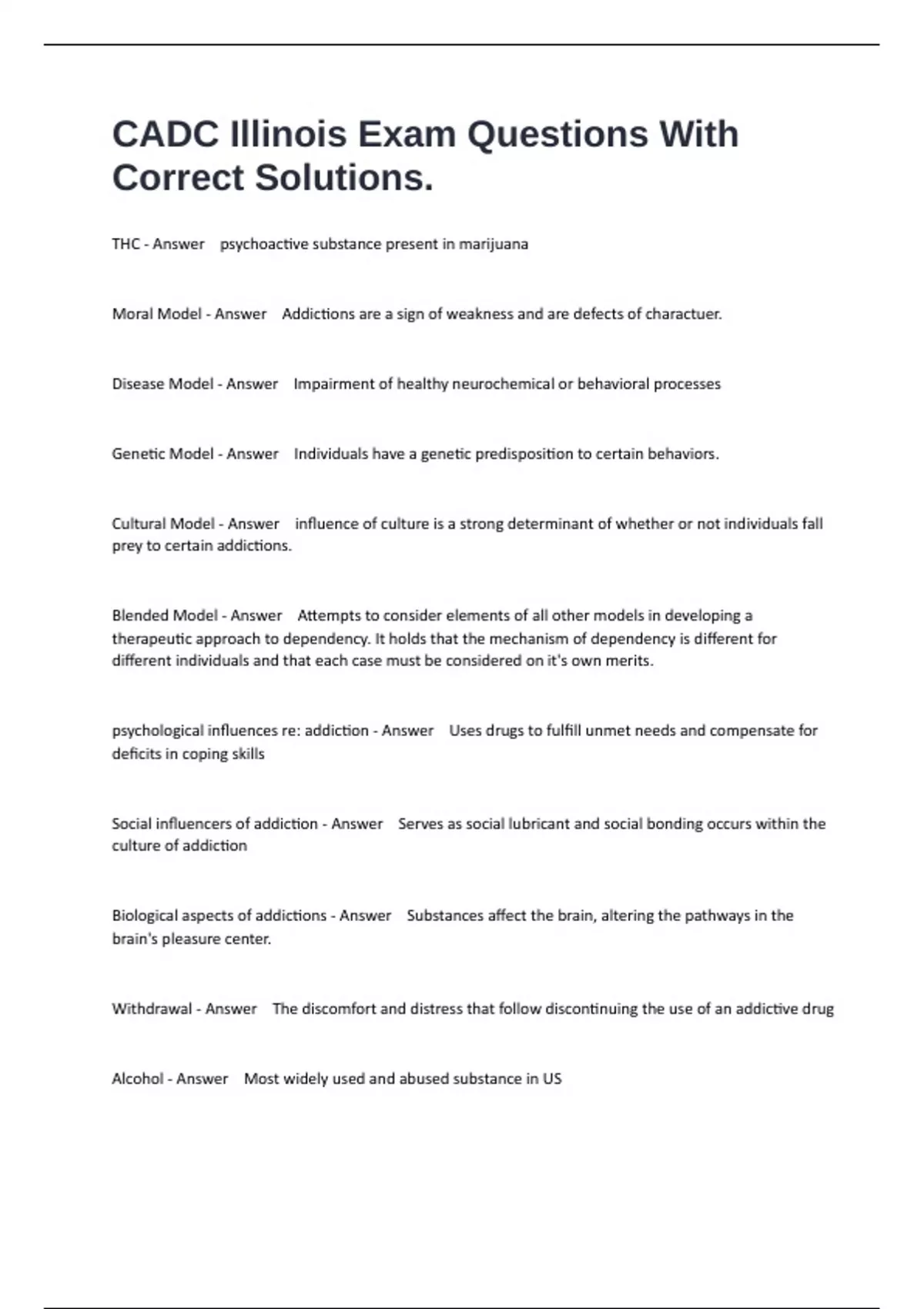 THC - Answer psychoactive substance present in marijuana Moral Model - Answer Addictions are a sign of weakness and are defects of charactuer. Disease Model - Answer Impairment of healthy neurochemical or behavioral processes Genetic Model - Answer Individuals have a genetic predisposition to certain behaviors. Cultural Model - Answer influence of culture is a strong determinant of whether or not individuals fall prey to certain addictions. Blended Model - Answer Attempts to consider elements of all other models in developing a therapeutic approach to dependency. It holds that the mechanism of dependency is different for different individuals and that each case must be considered on it's own merits. psychological influences re: addiction - Answer Uses drugs to fulfill unmet needs and compensate for deficits in coping skills Social influencers of addiction - Answer Serves as social lubricant and social bonding occurs within the culture of addiction Biological aspects of addictions - Answer Substances affect the brain, altering the pathways in the brain's pleasure center. Withdrawal - Answer The discomfort and distress that follow discontinuing the use of an addictive drug Alcohol - Answer Most widely used and abused substance in US