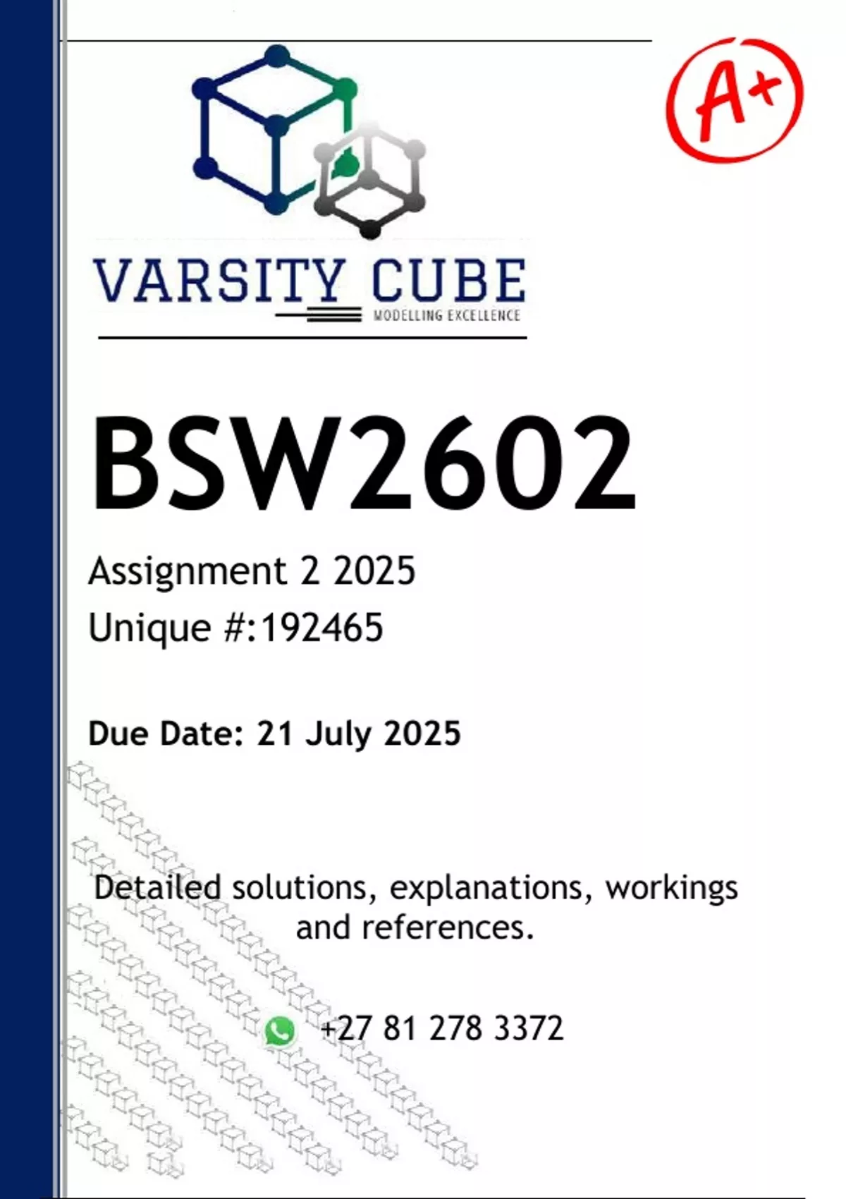 BSW2602 Assignment 2 (DETAILED ANSWERS) 2025 - DISTINCTION GUARANTEED - DISTINCTION GUARANTEED - DISTINCTION GUARANTEED Answers, guidelines, workings and references ,... QUESTION 1 [50] 1.1 Identify and explain five (5) functions and responsibilities of social workers in the field of occupational social work. (10) BSW2601 1.2 Discuss five (5) influences in the person’s micro, mezzo and macro system that could contribute to using substances. (10) 1.3 Identify and explain four needs and challenges faced by individuals with disabilities. (8) 1.4 Identify and discuss three (3) contexts of social welfare service delivery in South Africa. (6) 1.5 List six (6) target groups identified as the most vulnerable in terms of service delivery. (6) 1.6 Define the following terms in your own words: [10] 1.6.1 Polygynandry (2) 1.6.2 Social development (2) 1.6.3 Lesbian (2) 1.6.4 Bisexual (2) Downloaded by Corona Virus () lOMoARcPSD| 1.6.5 Intersex (2) QUESTION 2 [50] 2.1 What are the four (4) effects of substance abuse and dependence? (4) 2.2 Explain the following roles of families: [6] 2.2.1 Inherited roles (2) 2.2.2 Assigned roles (2) 2.2.3 Chosen roles (2) 2.3 Discuss any five (5) of the roles of the Child Justice Act 75 of 2008. (10) 2.4 Discuss your understanding of the following interdependency of ecological systems: [10] 2.4.1 Chrono system (2) 2.4.2 Macro system (2) 2.4.3 Exo system (2) 2.4.4 Mezzo system (2) 2.4.5 Micro system (2) 2.5 Describe any five (5) functions and tasks that social workers perform in schools. (10) 2.6 Discuss five (5) social assistance and relief services rendered to the vulnerable groups in South Africa. (10)