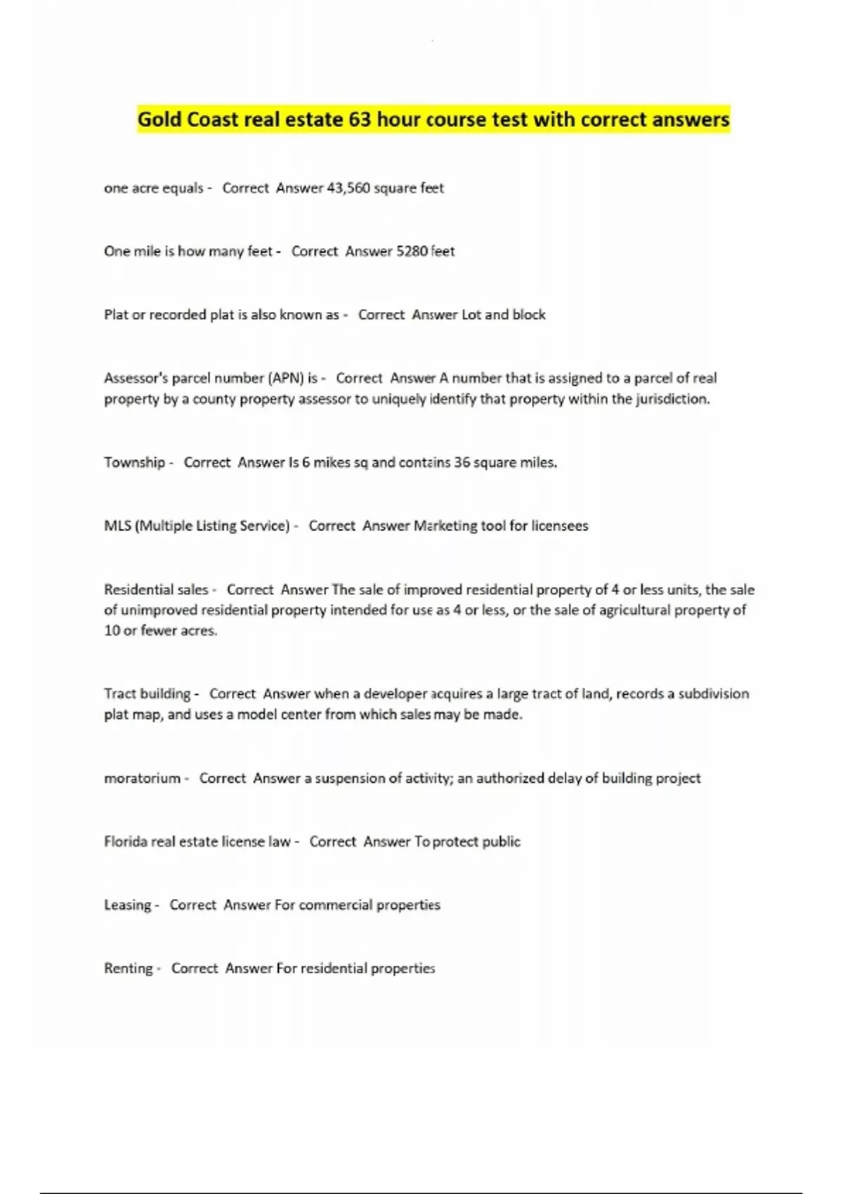 Gold Coast real estate 63 hour course test with correct answers one acre equals - Correct Answer 43,560 square feet One mile is how many feet - Correct Answer 5280 feet Plat or recorded plat is also known as - Correct Answer Lot and block Assessor's parcel number (APN) is - Correct Answer A number that is assigned to a parcel of real property by a county property assessor to uniquely identify that property within the jurisdiction. Township - Correct Answer Is 6 mikes sq and contains 36 square miles. MLS (Multiple Listing Service) - Correct Answer Marketing tool for licensees Residential sales - Correct Answer The sale of improved residential property of 4 or less units, the sale of unimproved residential property intended for use as 4 or less, or the sale of agricultural property of 10 or fewer acres. Tract building - Correct Answer when a developer acquires a large tract of land, records a subdivision plat map, and uses a model center from which sales may be made. moratorium - Correct Answer a suspension of activity; an authorized delay of building project Florida real estate license law - Correct Answer To protect public Leasing - Correct Answer For commercial properties Renting - Correct Answer For residential properties Sales associate that wants to be broker - Correct Answer Needs to actively licensed 24 months within 5 years Broker Associate - Correct Answer A person who holds a broker's license but chooses to register and work in real estate under the direction of another broker. Florida rea estate license - Correct Answer Does not require to be resident of state or be a citizen of united states Background questions - Correct Answer Must discolse any convictions