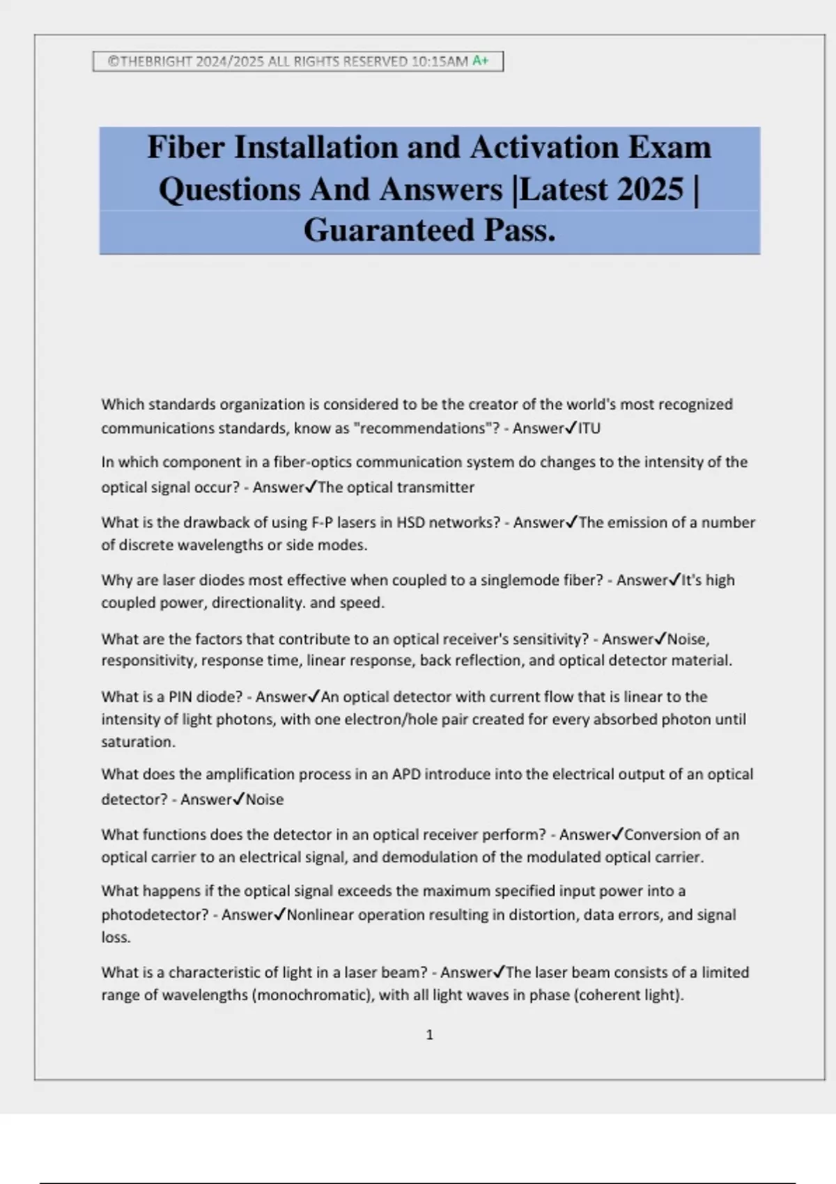 ©THEBRIGHT 2024/2025 ALL RIGHTS RESERVED 10:15AM A+ 1 Fiber Installation and Activation Exam Questions And Answers |Latest 2025 | Guaranteed Pass. Which standards organization is considered to be the creator of the world's most recognized communications standards, know as "recommendations"? - AnswerITU In which component in a fiber-optics communication system do changes to the intensity of the optical signal occur? - AnswerThe optical transmitter What is the drawback of using F-P lasers in HSD networks? - AnswerThe emission of a number of discrete wavelengths or side modes. Why are laser diodes most effective when coupled to a singlemode fiber? - AnswerIt's high coupled power, directionality. and speed. What are the factors that contribute to an optical receiver's sensitivity? - AnswerNoise, responsitivity, response time, linear response, back reflection, and optical detector material. What is a PIN diode? - AnswerAn optical detector with current flow that is linear to the intensity of light photons, with one electron/hole pair created for every absorbed photon until saturation. What does the amplification process in an APD introduce into the electrical output of an optical detector? - AnswerNoise What functions does the detector in an optical receiver perform? - AnswerConversion of an optical carrier to an electrical signal, and demodulation of the modulated optical carrier. What happens if the optical signal exceeds the maximum specified input power into a photodetector? - AnswerNonlinear operation resulting in distortion, data errors, and signal loss. What is a characteristic of light in a laser beam? - AnswerThe laser beam consists of a limited range of wavelengths (monochromatic), with all light waves in phase (coherent light). ©THEBRIGHT 2024/2025 ALL RIGHTS RESERVED 10:15AM A+ 2 Monitoring the status of optical nodes - AnswerInvolves the use of a node transponder that continuously monitors a number of critical functions. Digital return path transmissions - AnswerUse dense wavelength division multiplexing (DWDM) digital return transmitters in hub-to-headend architectures. What is channel bonding? - AnswerA 3.0 revision to Data Over Cable Service Interface Specification (DOCSIS) that significantly increases upstream and downstream transport data rates. What is MPEG? - AnswerA universally accepted standard for digital television, first released in 1992. Which of the following is true about optical nodes? - AnswerThey contain four main sections: the optical reciever, the RF amplifier module, the reverse optical transmitter, and the DC power supply. What product based on the DOCSIS defines the protocols for IP telephony over HFC networks? - AnswerPacketCable In a centralized server VOD architecture, - AnswerThe number of servers needed for video content storage is smaller than in distributed server architecture. Which of the following statements about local ad insertion is true? - AnswerLocal ad insertion is performed usually by a video server. In regard to providing high-speed data (HSD) service, - AnswerThe CMTS can provide a data transfer rate up to 38Mbps using 256-QAM in a single 6MHz channel. Which of the following is true about the SONET transmission standard? - AnswerSONET is the North American standard used for telephony applications. Why was the zero-dispersion point in single-mode fiber moved to 1,550 nm? - AnswerTo take advantage of the low intrinsic absorption and lower attenuation at 1550nm single-mode fiber. What type of single-mode fiber is intended for FTTH installations? - AnswerThe ITU-T G.657 BiF What are the primary causes of intrinsic loss in SMF? - AnswerMaterial absorption and Rayleigh scattering The phenomenon, total internal reflection, is what enables an optical fiber to guide light. What characteristic of optical fiber causes total internal reflection? - AnswerThe difference in refractive indexes, between cladding, and core,causes light to be reflected off the cladding and back into the core along the optical fib