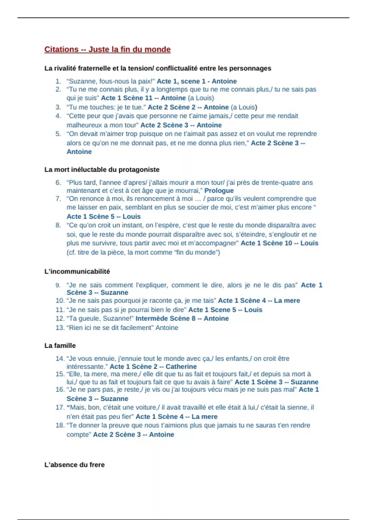 Fiche de citation complete par theme de Juste la fin du monde pour le bac de francais (objet d'etude du theatre)