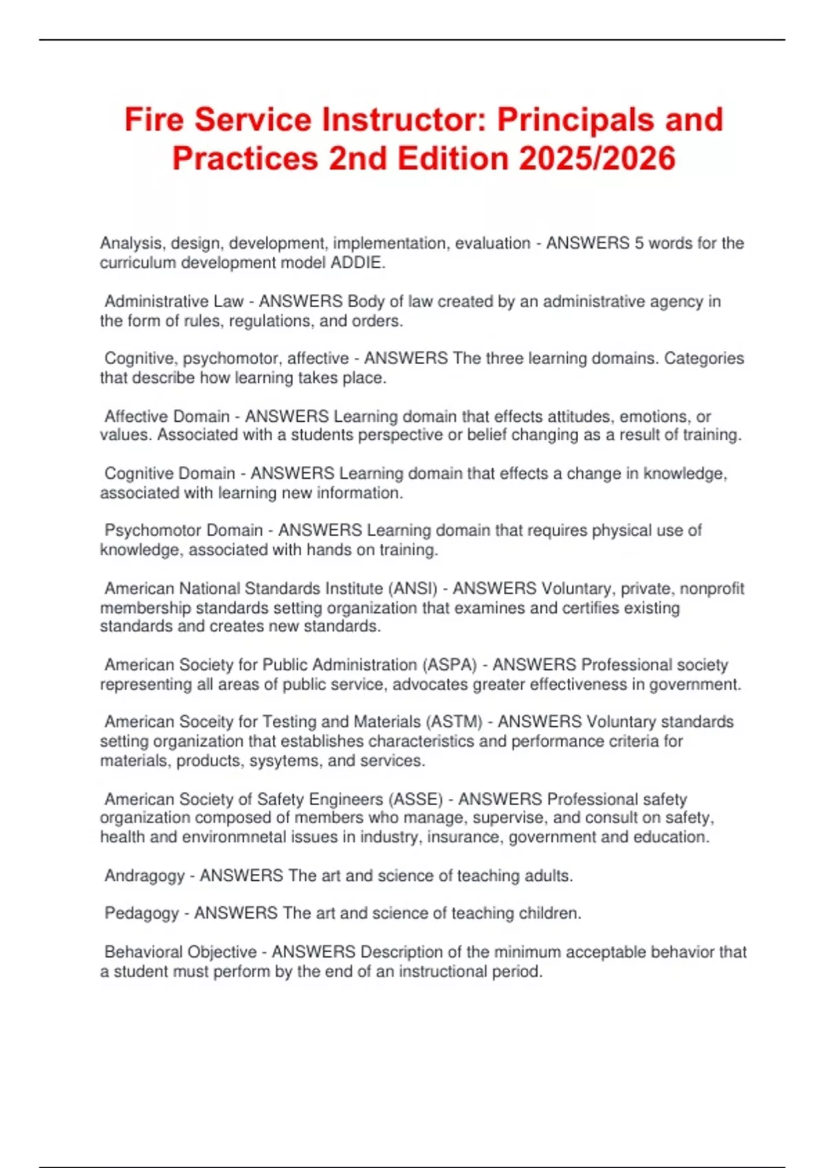 Fire Service Instructor: Principals and Practices 2nd Edition 2025/2026 Analysis, design, development, implementation, evaluation - ANSWERS 5 words for the curriculum development model ADDIE. Administrative Law - ANSWERS Body of law created by an administrative agency in the form of rules, regulations, and orders. Cognitive, psychomotor, affective - ANSWERS The three learning domains. Categories that describe how learning takes place. Affective Domain - ANSWERS Learning domain that effects attitudes, emotions, or values. Associated with a students perspective or belief changing as a result of training. Cognitive Domain - ANSWERS Learning domain that effects a change in knowledge, associated with learning new information. Psychomotor Domain - ANSWERS Learning domain that requires physical use of knowledge, associated with hands on training. American National Standards Institute (ANSI) - ANSWERS Voluntary, private, nonprofit membership standards setting organization that examines and certifies existing standards and creates new standards. American Society for Public Administration (ASPA) - ANSWERS Professional society representing all areas of public service, advocates greater effectiveness in government. American Soceity for Testing and Materials (ASTM) - ANSWERS Voluntary standards setting organization that establishes characteristics and performance criteria for materials, products, sysytems, and services. American Society of Safety Engineers (ASSE) - ANSWERS Professional safety organization composed of members who manage, supervise, and consult on safety, health and environmnetal issues in industry, insurance, government and education. Andragogy - ANSWERS The art and science of teaching adults. Pedagogy - ANSWERS The art and science of teaching children. Behavioral Objective - ANSWERS Description of the minimum acceptable behavior that a student must perform by the end of an instructional period. Block - ANSWERS Division of an occupation that includes related tasks with common factors. Case Study - ANSWERS Description of a real or hypothetical problem that an organization or an individual has dealt with or could deal with. Centers for Disease Control and prevention (CDC) - ANSWERS US government agency responsible for the collection and analysis of data regarding disease and health trends. Coaching - ANSWERS Process in which instructors direct the talent and skills performance of students by observing, evaluating, and making suggestions for improvement by giving motivational correction, postive reinformcement and constructive feedback. Mentoring - ANSWERS Relationship of trust between an experienced person and one of less experience for the purpose of growth. Code (Regulation) - ANSWERS Law established either by legislation or most commonly administrative agencies or local authorities. Designed to regulate, within its scope, the topic to which it relates. Code of Ethics - ANSWERS Organized group of ethical behavior guidelines that govern day to day activities of a profession, organization, or an individual. Code of Federal Regulations - ANSWERS Formal name given to the books or documents conatining the specific US regulations provided by law. Cognition - ANSWERS General concept that refers to all forms of knowing, including: Perceiving, imagining, reasoning and judging. Controlling - ANSWERS Management process for establishing and implementing mechanisms to ensure that objectives are attained. Empathy - ANSWERS Ability to understand the feelings and attitudes of another person. Interference - ANSWERS Those factors that prevent the receiver from fully receiving a message, may be created by either internal or extrenal sources. Judiciary Law - ANSWERS Usually the result of legal precedent or a judicial decision. Keystoning - ANSWERS Effect that occurs when the width of a projected image is wider at the top than at the bottom. Interpretive Exercise - ANSWERS A way to tests deeper and more complex levels of learning, more interesting and appealing to all student learning styles. Reliability - ANSWERS The consistency and accuracy of test. Criterion Based - ANSWERS The majority of tests written for fire and emergency services. Criterion Referenced Test - ANSWERS Test that compares performance against written standards. Summative Test - ANSWERS Test that measures student achievement in an entire area over a long period of time. Formative Test (Progress Test) - ANSWERS Periodic test that measures improvement and gives an instructor and students feedback on their learning progress during a course. (Quizzes) Performance Test (Skill Test) - ANSWERS Test that