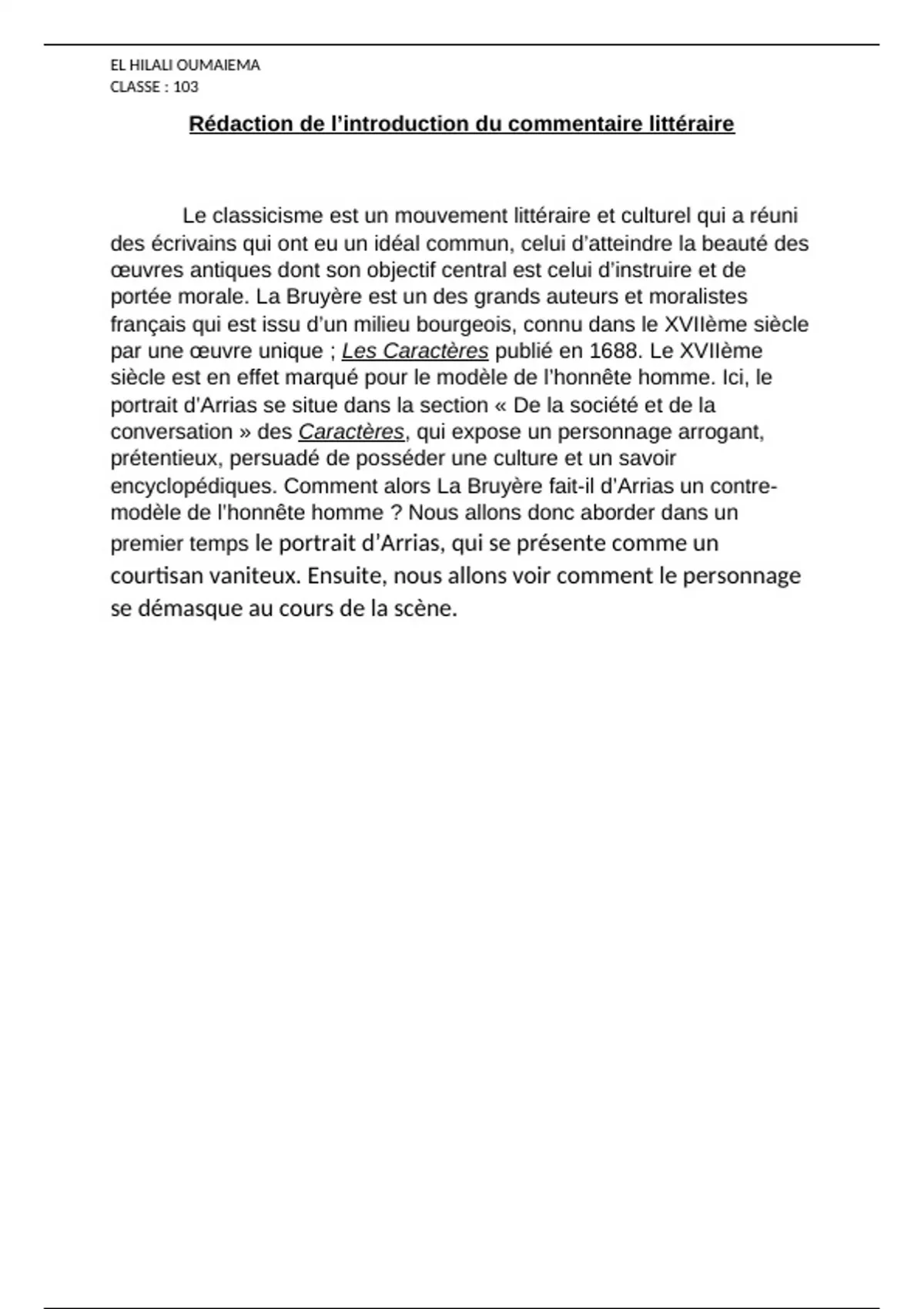Je vous propose la partie intro de ma dissertation sur Arrias: Les Caractères de La Bruyère, notée 20/20 en Première Générale.