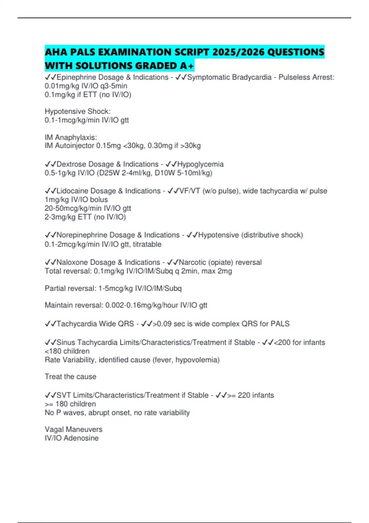 AHA PALS EXAMINATION SCRIPT 2025/2026 QUESTIONS WITH SOLUTIONS GRADED A+