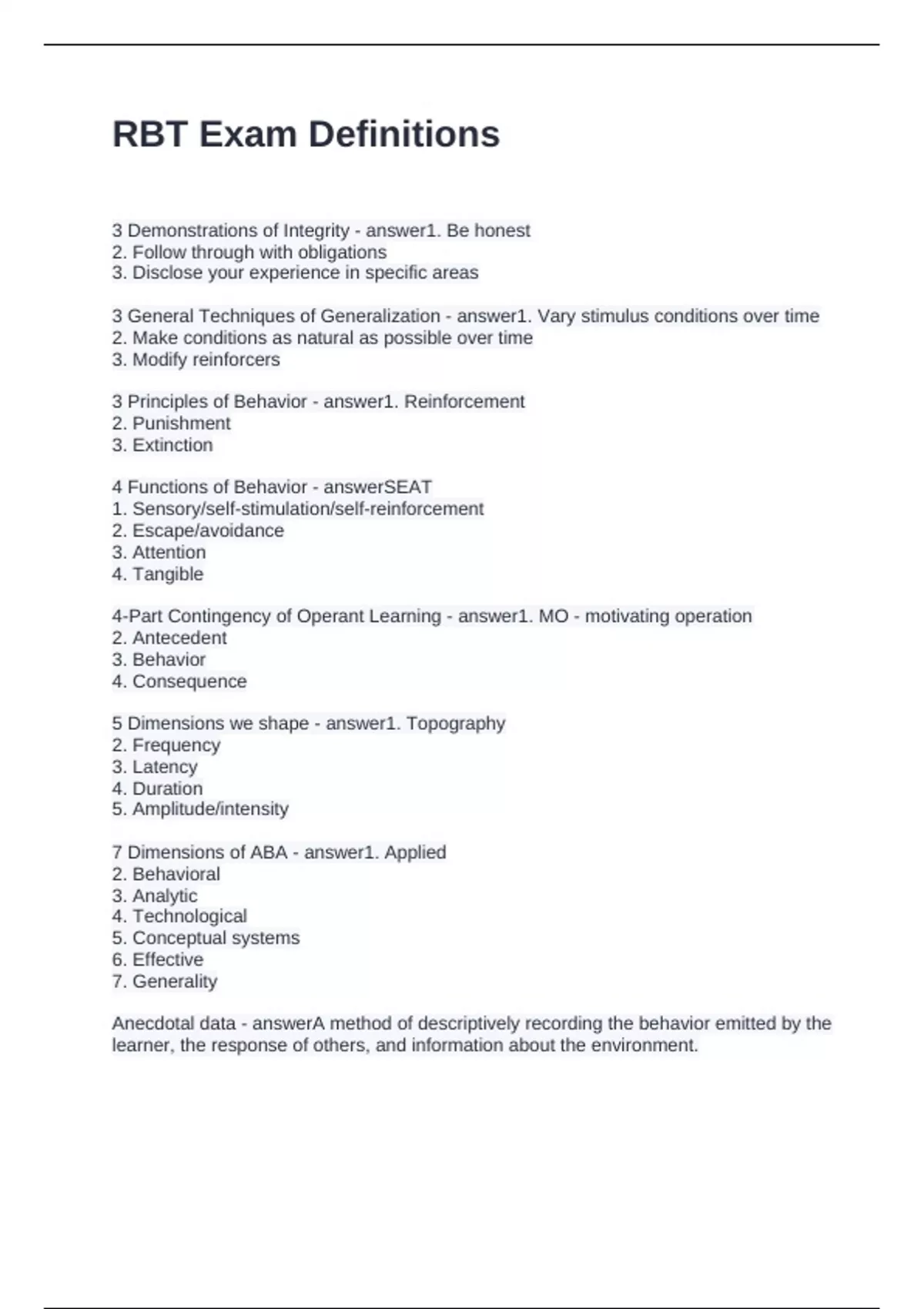 RBT Exam Definitions