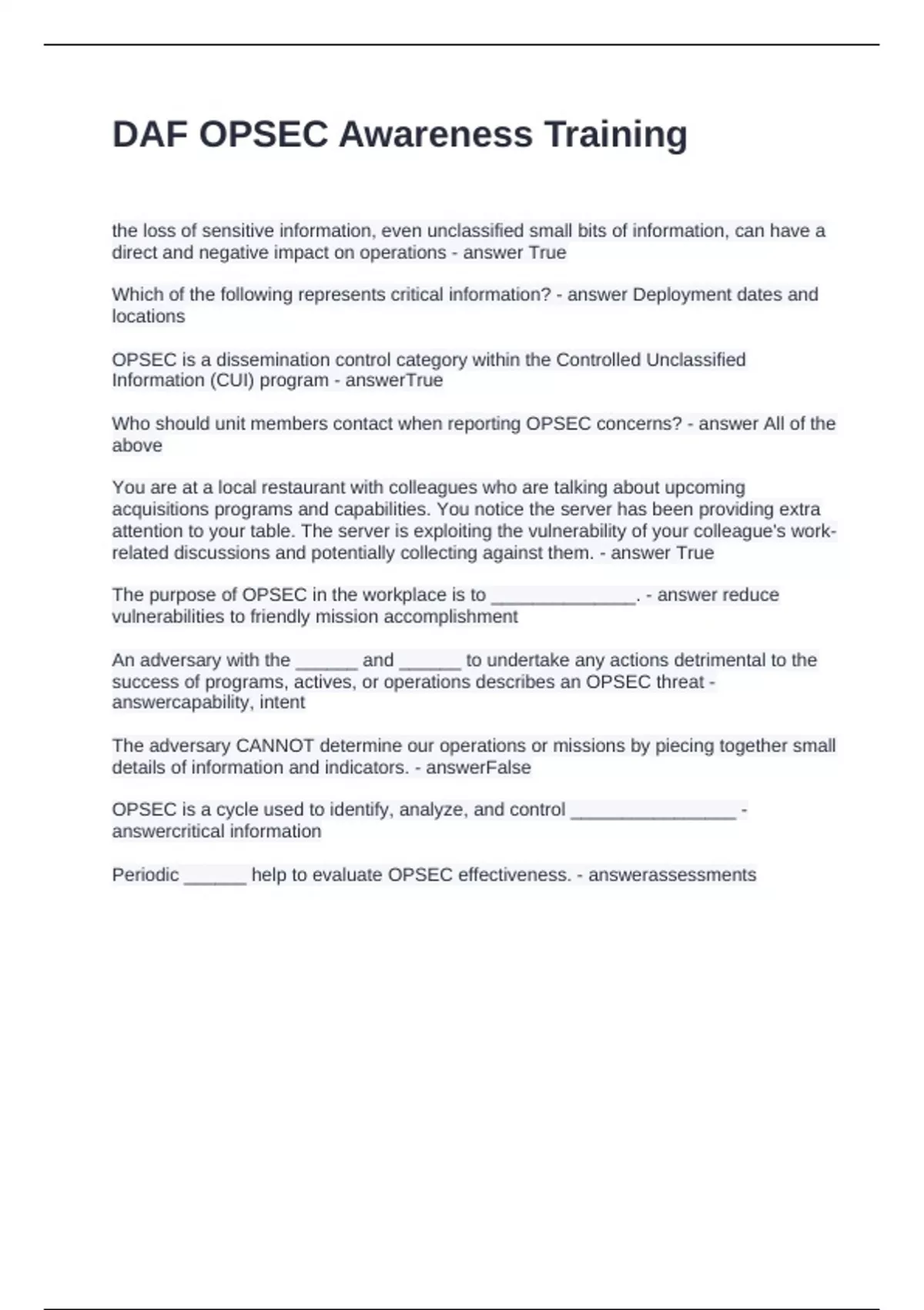 DAF OPSEC Awareness Training Questions and Answers 100% Solved