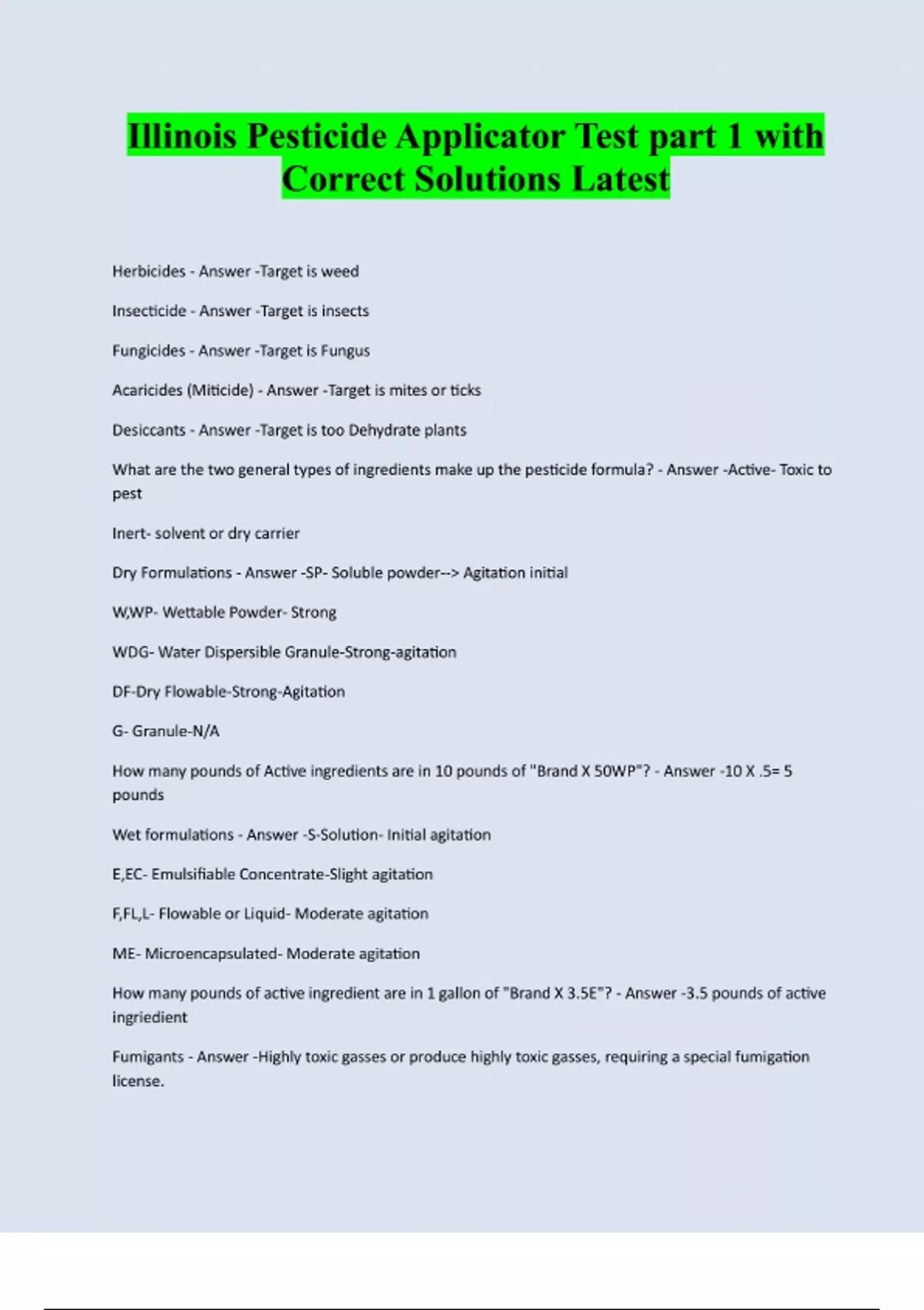 Illinois Pesticide Applicator Test part 1 with Correct Solutions Latest Herbicides - Answer -Target is weed Insecticide - Answer -Target is insects Fungicides - Answer -Target is Fungus Acaricides (Miticide) - Answer -Target is mites or ticks Desiccants - Answer -Target is too Dehydrate plants What are the two general types of ingredients make up the pesticide formula? - Answer -Active- Toxic to pest Inert- solvent or dry carrier Dry Formulations - Answer -SP- Soluble powder--> Agitation initial W,WP- Wettable Powder- Strong WDG- Water Dispersible Granule-Strong-agitation DF-Dry Flowable-Strong-Agitation G- Granule-N/A How many pounds of Active ingredients are in 10 pounds of "Brand X 50WP"? - Answer -10 X .5= 5 pounds Wet formulations - Answer -S-Solution- Initial agitation E,EC- Emulsifiable Concentrate-Slight agitation F,FL,L- Flowable or Liquid- Moderate agitation ME- Microencapsulated- Moderate agitation How many pounds of active ingredient are in 1 gallon of "Brand X 3.5E"? - Answer -3.5 pounds of active ingriedient Fumigants - Answer -Highly toxic gasses or produce highly toxic gasses, requiring a special fumigation license.Aerosols - Answer -Produce a spray of fine pesticide droplets Adjuvant - Answer -A chemical that modifies a pesticide's physical properties and /or enhances it's performance. Utility Agents - Answer --Compatibility agents -pH buffers -Antifoaming Agents Surfactants - Answer -Help individual spray droplets spread out on the treated surface. Stickers - Answer -Improve pesticide adherence to the treated surface. Penetrants - Answer -Improve systemic pesticide penetration into the treated surface. Physical incompatibility - Answer --Pesticide can't be physically mixed together. -Incompatible mixtures may settle, layer, curdle or gel. Chemical incompatibility - Answer --Synergism: Increased activity or effectiveness as opposed to applying the products separately -Antagonism: Decreased activity or effectiveness as opposed to applying the product separately Who's responsible for a failed mix when the labels provide no guidance? - Answer -The person mixing the batch If physical compatibility is a concern perform what test? - Answer -Jar Compatibility test If no label directions add products in this order. - Answer -1. fill tank 1/4 or 1/2 full 2. Begin Agitation 3. Add Utility agents ( if needed) 4. Add suspension forming products 5. add emulsifiable concetrates 6.Add solution forming products 7. add spray modifiers 8. Finish filling tank with carrier Selective pesticides - Answer -COntrol some related pests, but not others Unselective pesticides - Answer -Control all related pestsSystemic pesticides - Answer -move within the plant Contact pesticides - Answer -don't move within the plant Residual pesticides - Answer -pesticides remain sufficiently active to kill pests for several days weeks or months after application
