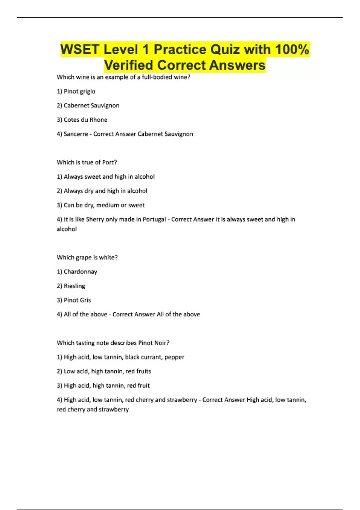 WSET Level 1 Practice Quiz with 100% Verified Correct Answers Which wine is an example of a full-bodied wine? 1) Pinot grigio 2) Cabernet Sauvignon 3) Cotes du Rhone 4) Sancerre - Correct Answer Cabernet Sauvignon Which is true of Port? 1) Always sweet and high in alcohol 2) Always dry and high in alcohol 3) Can be dry, medium or sweet 4) It is like Sherry only made in Portugal - Correct Answer It is always sweet and high in alcohol Which grape is white? 1) Chardonnay 2) Riesling 3) Pinot Gris 4) All of the above - Correct Answer All of the above Which tasting note describes Pinot Noir? 1) High acid, low tannin, black currant, pepper 2) Low acid, high tannin, red fruits 3) High acid, high tannin, red fruit 4) High acid, low tannin, red cherry and strawberry - Correct Answer High acid, low tannin, red cherry and strawberry Which wine is a dry, red wine? 1) Rioja 2) Chianti 3) Chateauneuf-du-Pape 4) All of the above - Correct Answer All of the above