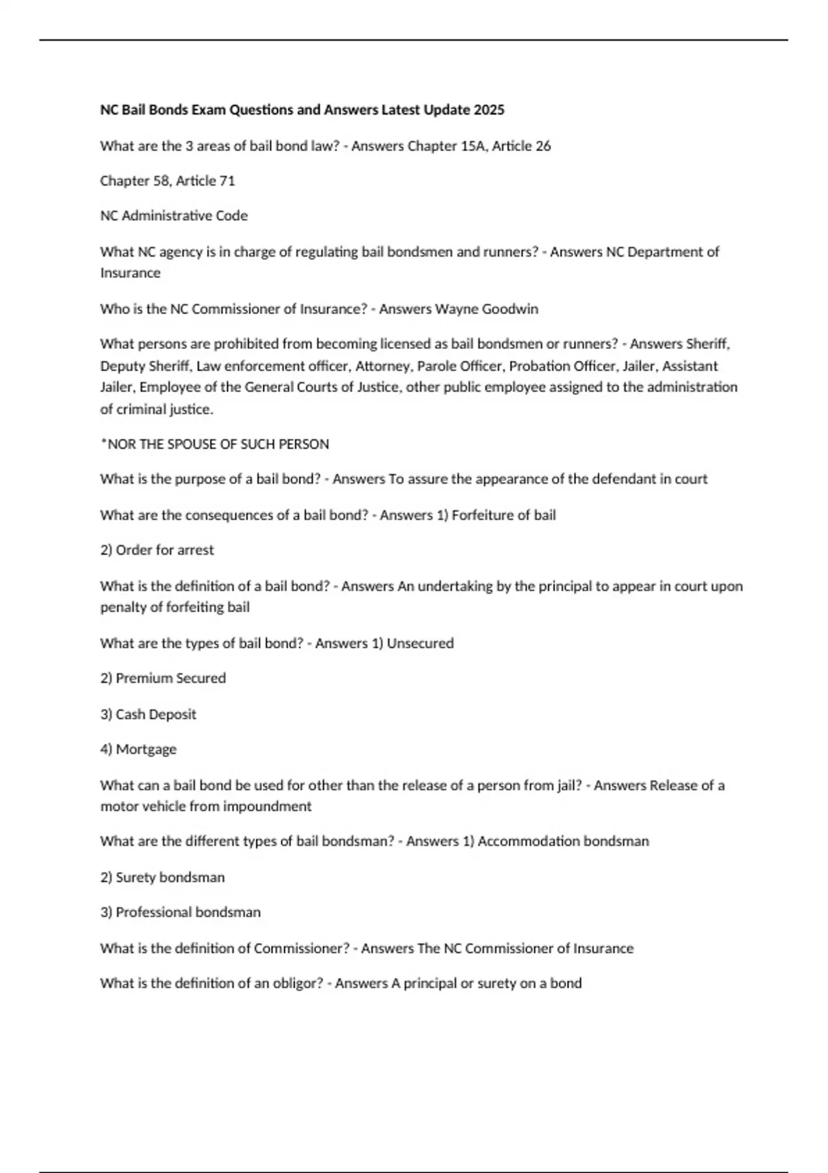 NC Bail Bonds Exam Questions and Answers Latest Update 2025 What are the 3 areas of bail bond law? - Answers Chapter 15A, Article 26 Chapter 58, Article 71 NC Administrative Code What NC agency is in charge of regulating bail bondsmen and runners? - Answers NC Department of Insurance Who is the NC Commissioner of Insurance? - Answers Wayne Goodwin What persons are prohibited from becoming licensed as bail bondsmen or runners? - Answers Sheriff, Deputy Sheriff, Law enforcement officer, Attorney, Parole Officer, Probation Officer, Jailer, Assistant Jailer, Employee of the General Courts of Justice, other public employee assigned to the administration of criminal justice. *NOR THE SPOUSE OF SUCH PERSON What is the purpose of a bail bond? - Answers To assure the appearance of the defendant in court What are the consequences of a bail bond? - Answers 1) Forfeiture of bail 2) Order for arrest What is the definition of a bail bond? - Answers An undertaking by the principal to appear in court upon penalty of forfeiting bail What are the types of bail bond? - Answers 1) Unsecured 2) Premium Secured 3) Cash Deposit 4) Mortgage What can a bail bond be used for other than the release of a person from jail? - Answers Release of a motor vehicle from impoundment What are the different types of bail bondsman? - Answers 1) Accommodation bondsman 2) Surety bondsman 3) Professional bondsman What is the definition of Commissioner? - Answers The NC Commissioner of Insurance What is the definition of an obligor? - Answers A principal or surety on a bond What is the definition of a surety? - Answers One who with the principal is liable for the amount of the bail bond upon forfeiture What are the 3 types of sureties? - Answers 1) Professional Bondsman 2) Accommodation Bondsman 3) Insurer (Insurance Company) When a person is arrested, what form shows the charge, time, and location to appear in court? - Answers Conditions of release What form is the conditions of release transferred to for the release of a defendant? - Answers The Appearance bond What does the bond affidavit provide information on? - Answers Premium and Collateral What is the maximum bail bond premium that can be charged? - Answers 15% What are the only 2 things of value a bondsman can accept for posting a bond? - Answers Premium or Collateral What is collateral? - Answers Something of value to indemnify or protect the bondsman in the event of forfeiture What are the different types of collateral? - Answers 1) Money or other negotiable instrument 2) Personal Property 3) Real Property 4) Indemnity agreement How much collateral is a bondsman allowed to take for posting a bonds? - Answers 100% What is a collateral trust account? - Answers A bank account for cash collateral received on bail bonds If collateral is taken, what is required on the receipt? - Answers A full description and value of the collateral When must collateral be returned? - Answers Within 72 hours after final termination of liability on the bond What is the requirement of returning collateral other than cash? - Answers It must be returne