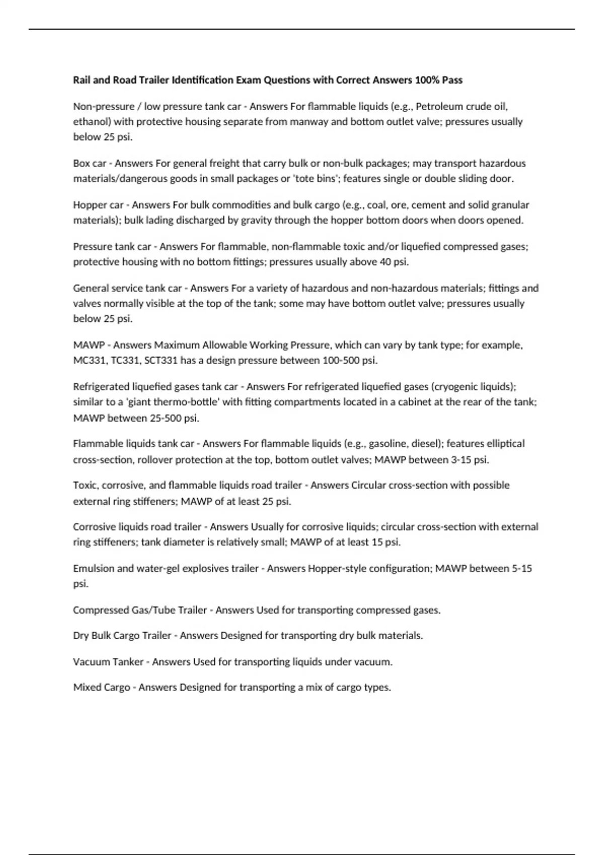 Rail and Road Trailer Identification Exam Questions with Correct Answers 100% Pass Non-pressure / low pressure tank car - Answers For flammable liquids (e.g., Petroleum crude oil, ethanol) with protective housing separate from manway and bottom outlet valve; pressures usually below 25 psi. Box car - Answers For general freight that carry bulk or non-bulk packages; may transport hazardous materials/dangerous goods in small packages or 'tote bins'; features single or double sliding door. Hopper car - Answers For bulk commodities and bulk cargo (e.g., coal, ore, cement and solid granular materials); bulk lading discharged by gravity through the hopper bottom doors when doors opened. Pressure tank car - Answers For flammable, non-flammable toxic and/or liquefied compressed gases; protective housing with no bottom fittings; pressures usually above 40 psi. General service tank car - Answers For a variety of hazardous and non-hazardous materials; fittings and valves normally visible at the top of the tank; some may have bottom outlet valve; pressures usually below 25 psi. MAWP - Answers Maximum Allowable Working Pressure, which can vary by tank type; for example, MC331, TC331, SCT331 has a design pressure between 100-500 psi. Refrigerated liquefied gases tank car - Answers For refrigerated liquefied gases (cryogenic liquids); similar to a 'giant thermo-bottle' with fitting compartments located in a cabinet at the rear of the tank; MAWP between 25-500 psi. Flammable liquids tank car - Answers For flammable liquids (e.g., gasoline, diesel); features elliptical cross-section, rollover protection at the top, bottom outlet valves; MAWP between 3-15 psi.