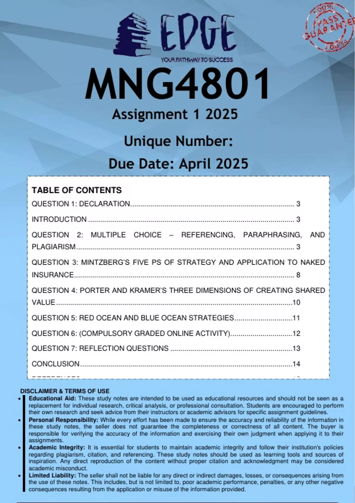 Well-structured MNG4801 Assignment 1 (ANSWERS) 2025 - DISTINCTION GUARANTEED. (DETAILED ANSWERS - DISTINCTION GUARANTEED!)..... Critically discuss Mintzberg's five Ps of strategy and apply them to Naked Insurance’s strategy. After reading section 1.2.3.2 in your prescribed book titled “Strategy into the 21st century”, conclude your discussion, by providing your perspective on what you believe has been the most influential development in the 21st century. In addition to incorporating and referencing theory from the prescribed material into your answer for Question 3, you also need to locate, incorporate and reference 1 (one) academic article of your choice (published between ) from the Unisa library intoyour discussion. Incorporate appropriate theory and examples from the case study. <Your answer should be 1.5 pages> [15 marks] Question 4: Critically analyse Naked Insurance’s organizational context with regards to shared value by incorporating Porter and Kramer’s three dimensions of creating shared value. Begin your analysis by introducing the concept of shared value and then apply your answer to the context in the case study. Incorporate appropriate theory and examples from the case study. <Your answer should be 1.5 pages> [13 marks] Question 5: Critically discuss the difference between red ocean and blue ocean strategy. Apply your answer to the case study and conclude your analysis by commenting (with motivation) on whether Naked Insurance has employed a blue ocean or red ocean strategy. Incorporate appropriate theory and examples from the case study.