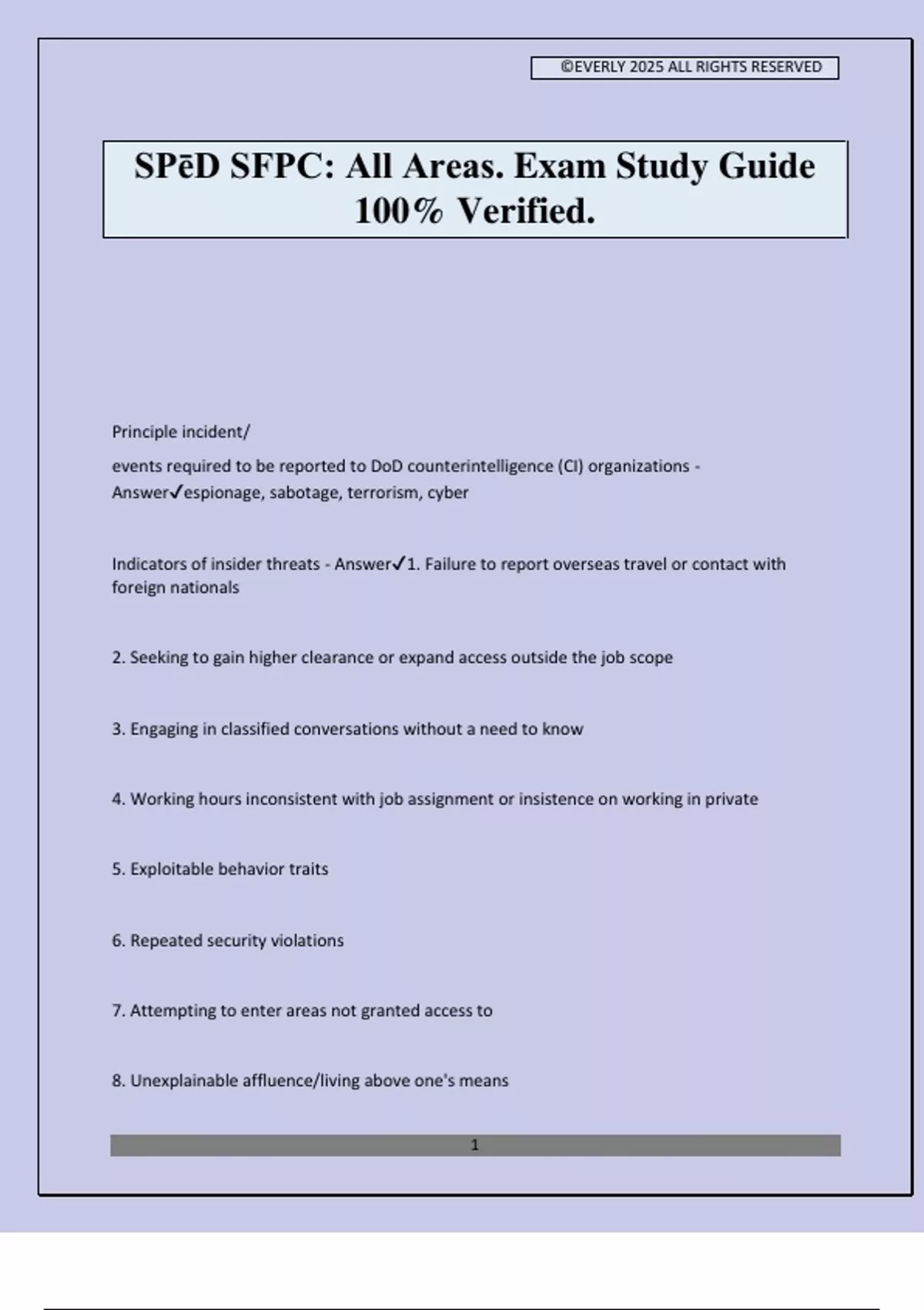 ©EVERLY 2025 ALL RIGHTS RESERVED 1 SPēD SFPC: All Areas. Exam Study Guide 100% Verified. Principle incident/ events required to be reported to DoD counterintelligence (CI) organizations - Answerespionage, sabotage, terrorism, cyber Indicators of insider threats - Answer1. Failure to report overseas travel or contact with foreign nationals 2. Seeking to gain higher clearance or expand access outside the job scope 3. Engaging in classified conversations without a need to know 4. Working hours inconsistent with job assignment or insistence on working in private 5. Exploitable behavior traits 6. Repeated security violations 7. Attempting to enter areas not granted access to 8. Unexplainable affluence/living above one's means ©EVERLY 2025 ALL RIGHTS RESERVED 2 9. Anomalies (adversary taking actions which indicate they are knowledgeable to information) 10. Illegal downloads of information/files Elements that should be considered in identifying Critical Program Information - AnswerElements which if compromised could: 1. cause significant degradation in mission effectiveness, 2. shorten the expected combat-effective life of the system 3. reduce technological advantage 4. significantly alter program direction; or 5. enable an adversary to defeat, counter, copy, or reverseengineer the technology or capability. asset, threat, vulnerability, risk, countermeasures - AnswerElements that a security professional should consider when assessing and managing risks to DoD assets The three categories of Special Access Programs - Answeracquisition, intelligence, and operations and support Three different types of threats to classified information - AnswerInsider Threat, Foreign Intelligence Entities (FIE) and Cybersecurity Threat ©EVERLY 2025 ALL RIGHTS RESERVED 3 The concept of an insider threat - AnswerAn employee who may represent a threat to national security. These threats encompass potential espionage, violent acts against the Government or the nation, and unauthorized disclosure of classified information, including the vast amounts of classified data available on interconnected United States Government computer networks and systems. The purpose of the Foreign Visitor Program - AnswerTo track and approve access by a foreign entity to information that is classified; and to approve access by a foreign entity to information that is unclassified, related to a U.S. Government contract, or plant visits covered by ITAR. Special Access Program - AnswerA program established for a specific class of classified information that imposes safeguarding and access requirements that exceed those normally required for information at the same classification level. Enhanced security requirements for protecting Special Access Program (SAP) information - AnswerWithin Personnel Security: • Access Rosters; • Billet Structures (if required); • Indoctrination Agreement; • Clearance based on an appropriate investigation completed within the last 5 years; • Individual must materially contribute to the program in addition to having the need to know; • All individuals with access to SAP are subject to a random counterintelligence scope polygraph examination; • Polygraph examination, if approved by the DepSecDef, may be used as a mandatory access determination; • Tier review process; • Personnel must have a Secret or Top Secret clearance;