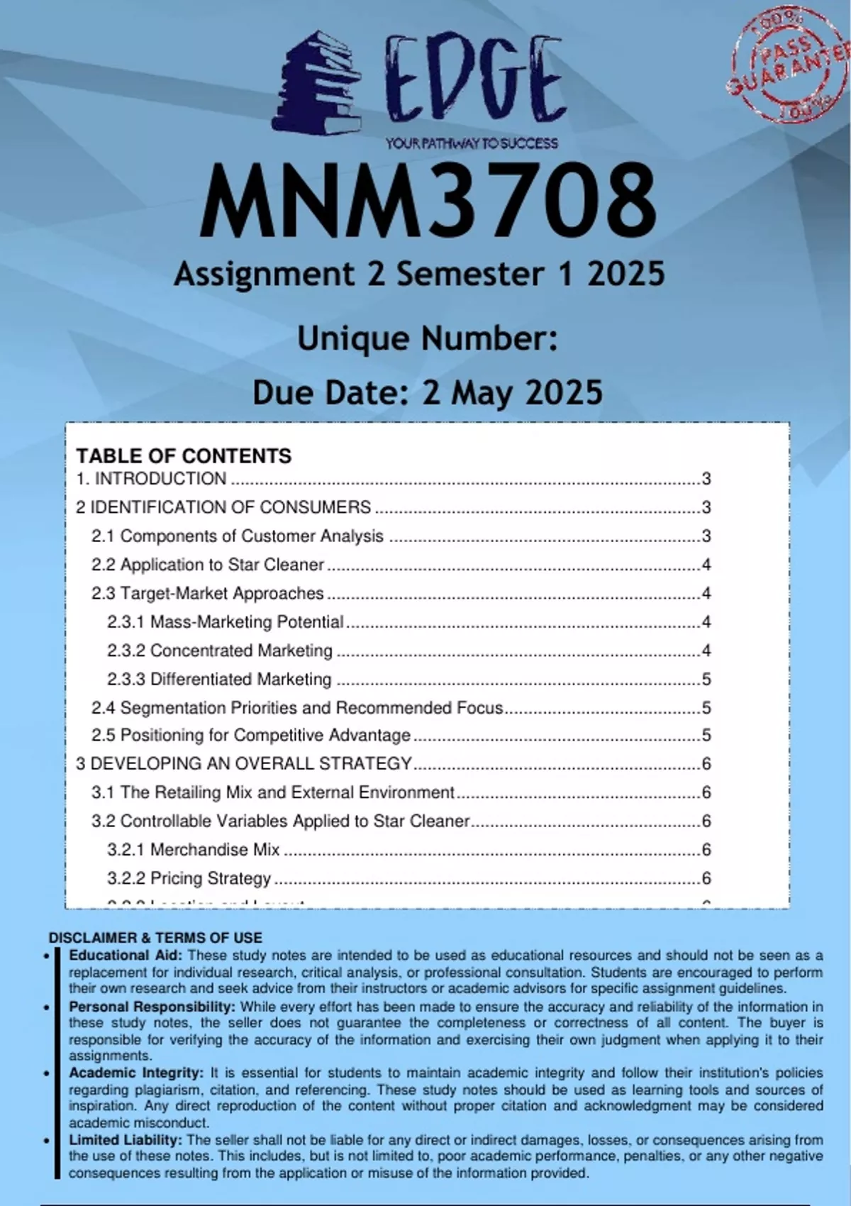 Well-structured MNM3708 Assignment 2 (ANSWERS) Semester 1 2025 - DISTINCTION GUARANTEED. (DETAILED ANSWERS - DISTINCTION GUARANTEED!).....