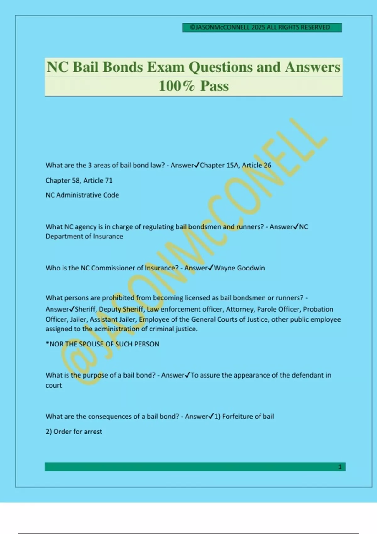 ©JASONMcCONNELL 2025 ALL RIGHTS RESERVED 1 NC Bail Bonds Exam Questions and Answers 100% Pass What are the 3 areas of bail bond law? - AnswerChapter 15A, Article 26 Chapter 58, Article 71 NC Administrative Code What NC agency is in charge of regulating bail bondsmen and runners? - AnswerNC Department of Insurance Who is the NC Commissioner of Insurance? - AnswerWayne Goodwin What persons are prohibited from becoming licensed as bail bondsmen or runners? - AnswerSheriff, Deputy Sheriff, Law enforcement officer, Attorney, Parole Officer, Probation Officer, Jailer, Assistant Jailer, Employee of the General Courts of Justice, other public employee assigned to the administration of criminal justice. *NOR THE SPOUSE OF SUCH PERSON What is the purpose of a bail bond? - AnswerTo assure the appearance of the defendant in court What are the consequences of a bail bond? - Answer1) Forfeiture of bail 2) Order for arrest ©JASONMcCONNELL 2025 ALL RIGHTS RESERVED 2 What is the definition of a bail bond? - AnswerAn undertaking by the principal to appear in court upon penalty of forfeiting bail What are the types of bail bond? - Answer1) Unsecured 2) Premium Secured 3) Cash Deposit 4) Mortgage What can a bail bond be used for other than the release of a person from jail? - AnswerRelease of a motor vehicle from impoundment What are the different types of bail bondsman? - Answer1) Accommodation bondsman 2) Surety bondsman 3) Professional bondsman What is the definition of Commissioner? - AnswerThe NC Commissioner of Insurance What is the definition of an obligor? - AnswerA principal or surety on a bond What is the definition of a surety? - AnswerOne who with the principal is liable for the amount of the bail bond upon forfeiture What are the 3 types of sureties? - Answer1) Professional Bondsman 2) Accommodation Bondsman 3) Insurer (Insurance Company) When a person is arrested, what form shows the charge, time, and location to appear in court? - AnswerConditions of release