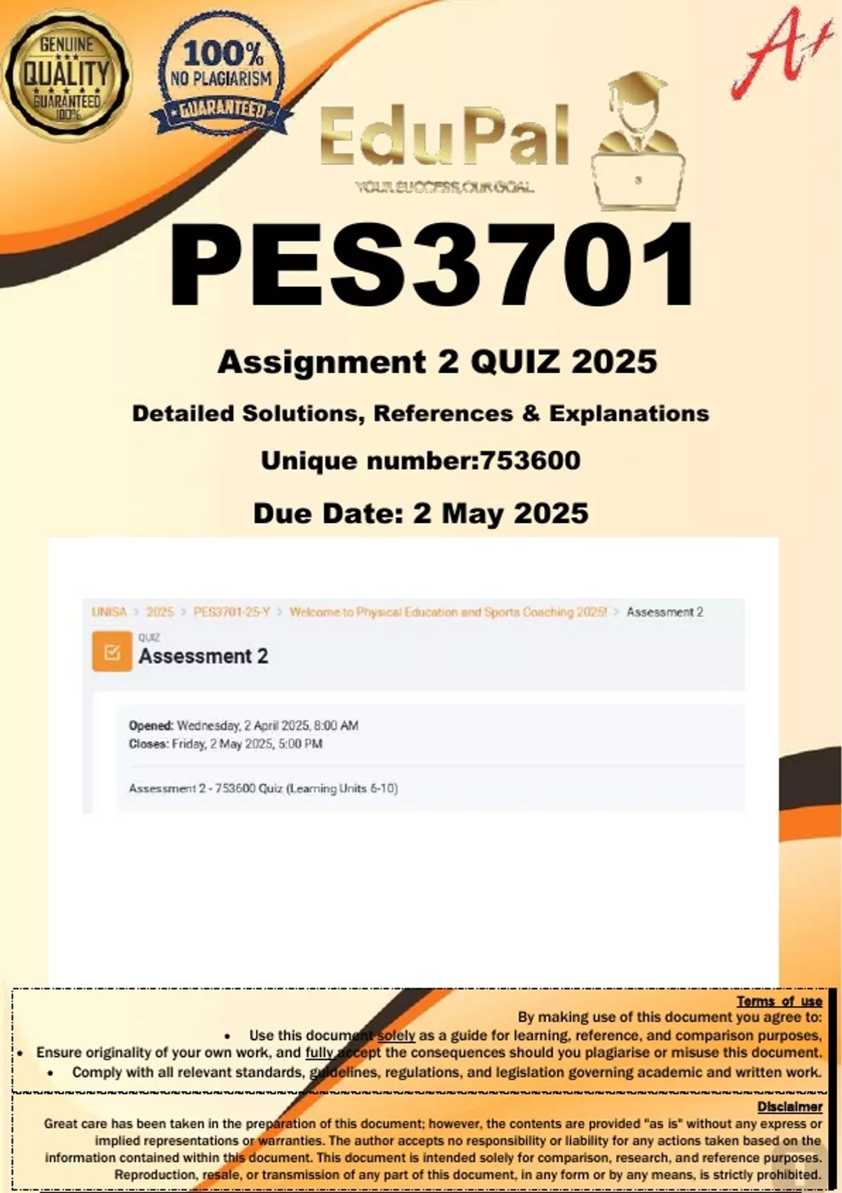 PES3701 Assignment 2 (COMPLETE GUIDELINE) 2025 (753600) - DUE 2 May 2025; 100% TRUSTED Complete, trusted solutions and explanations. For assistance, Whats-App 0.6.7-1.7.1-1.7.3.9. Ensure your success with us..