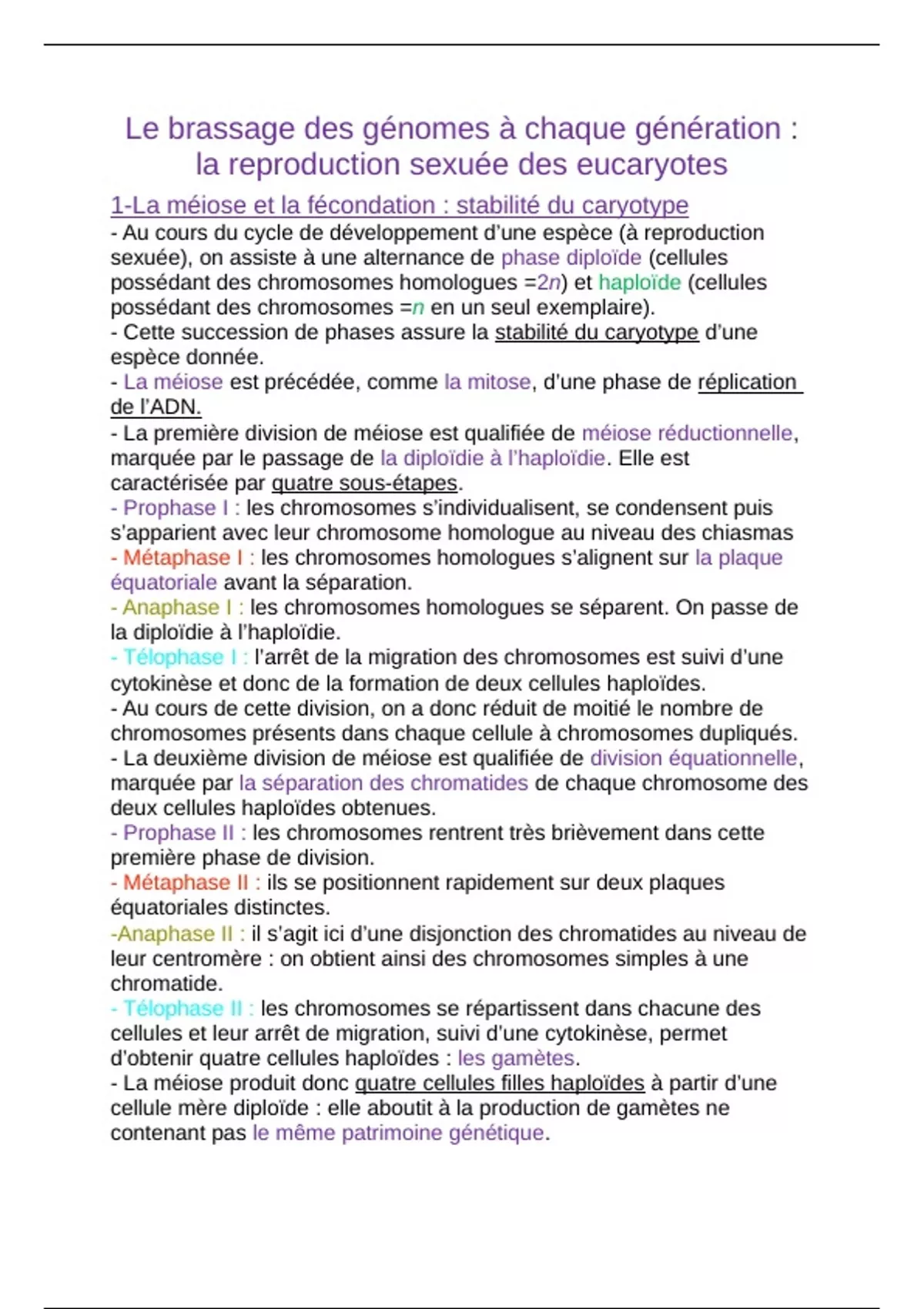 1-La méiose et la fécondation : stabilité du caryotype