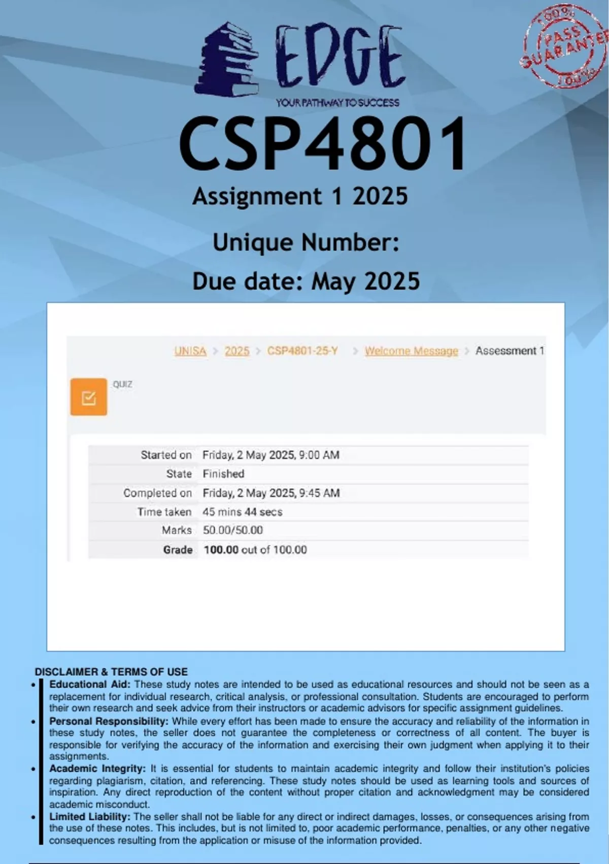 CSP4801 Assignment 1 QUIZ (100% ANSWERS) 2025 - DISTINCTION GUARANTEED