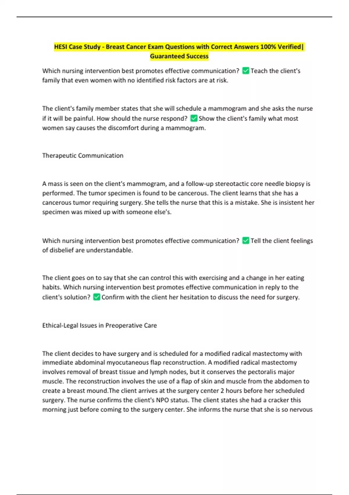 performed. The tumor specimen is found to be cancerous. The client learns that she has a