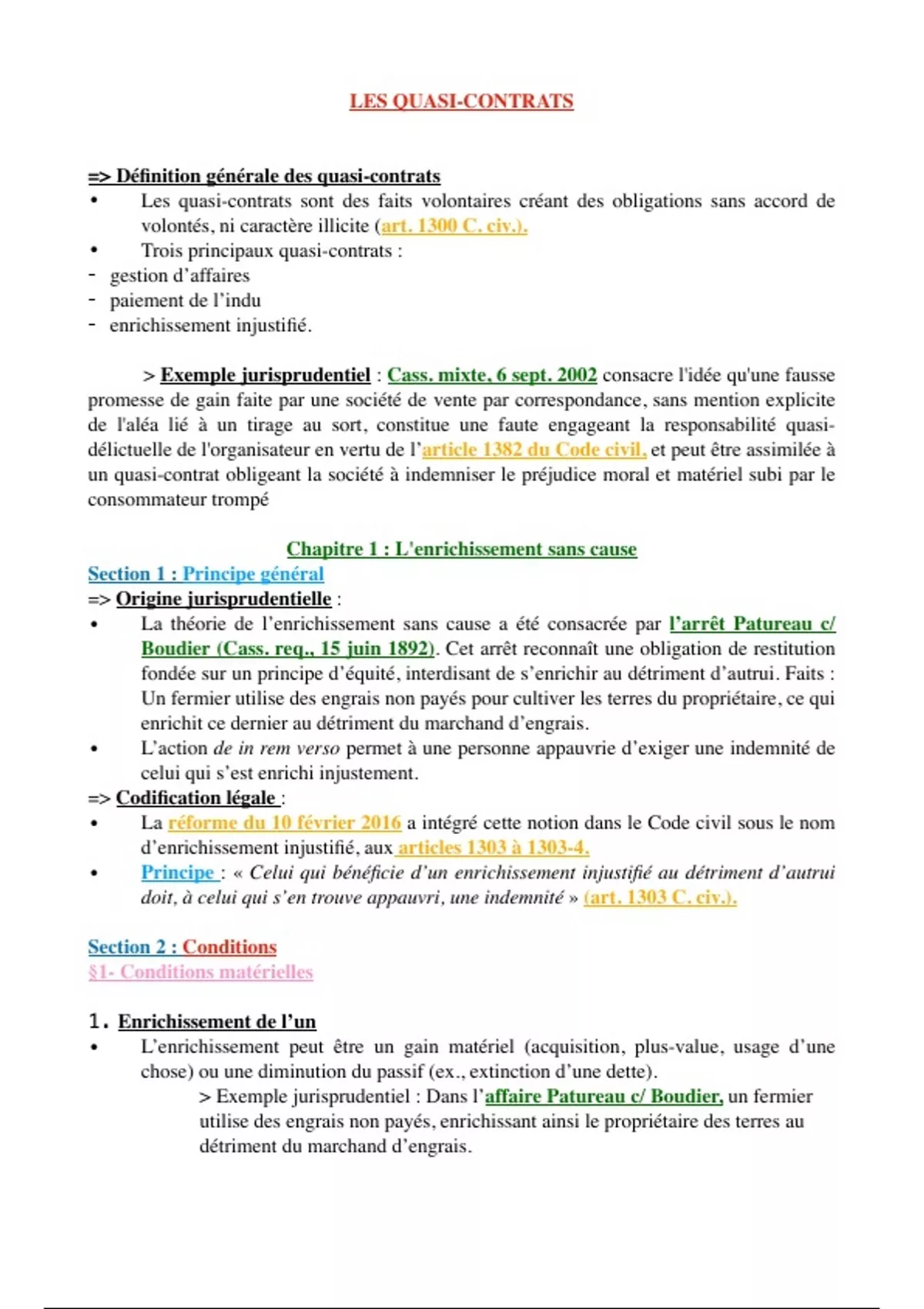 Ce cours traite des quasi-contrats, c’est-à-dire des situations où une personne s’engage sans contrat, mais de manière licite, à réparer un déséquilibre entre deux patrimoines (article 1300 du Code civil). Il en existe trois principaux : l’enrichissement injustifié, le paiement de l’indu, et la gestion d’affaires. L’enrichissement injustifié repose sur le principe d’équité, consacré par la jurisprudence (arrêt Patureau c/ Boudier, 1892) et codifié en 2016 (art. 1303 et suivants). Il suppose un enrichissement corrélé à un appauvrissement sans justification légale ou contractuelle. Le paiement de l’indu (art. 1302) concerne les cas où une somme est versée sans qu’elle soit due ; la restitution est alors en principe automatique. Enfin, la gestion d’affaires (art. 1301) intervient lorsqu’une personne s’occupe spontanément des affaires d’autrui dans son intérêt. Chaque quasi-contrat obéit à des conditions précises (matérielles, juridiques) et produit des effets en termes d’obligations de restitution ou d’indemnisation. Ce régime permet d’assurer une certaine justice contractuelle sans qu’un contrat formel soit nécessaire.