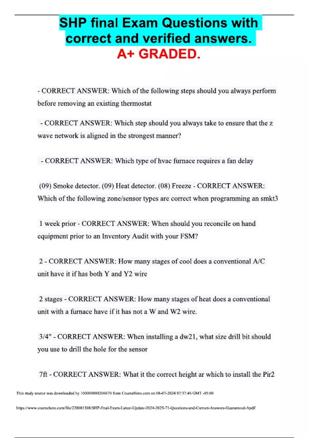 SHP final Exam Questions with correct and verified answers. A+ GRADED. - CORRECT ANSWER: Which of the following steps should you always perform before removing an existing thermostat - CORRECT ANSWER: Which step should you always take to ensure that the z wave network is aligned in the strongest manner? - CORRECT ANSWER: Which type of hvac furnace requires a fan delay (09) Smoke detector. (09) Heat detector. (08) Freeze - CORRECT ANSWER: Which of the following zone/sensor types are correct when programming an smkt3 1 week prior - CORRECT ANSWER: When should you reconcile on hand equipment prior to an Inventory Audit with your FSM? 2 - CORRECT ANSWER: How many stages of cool does a conventional A/C unit have it if has both Y and Y2 wire