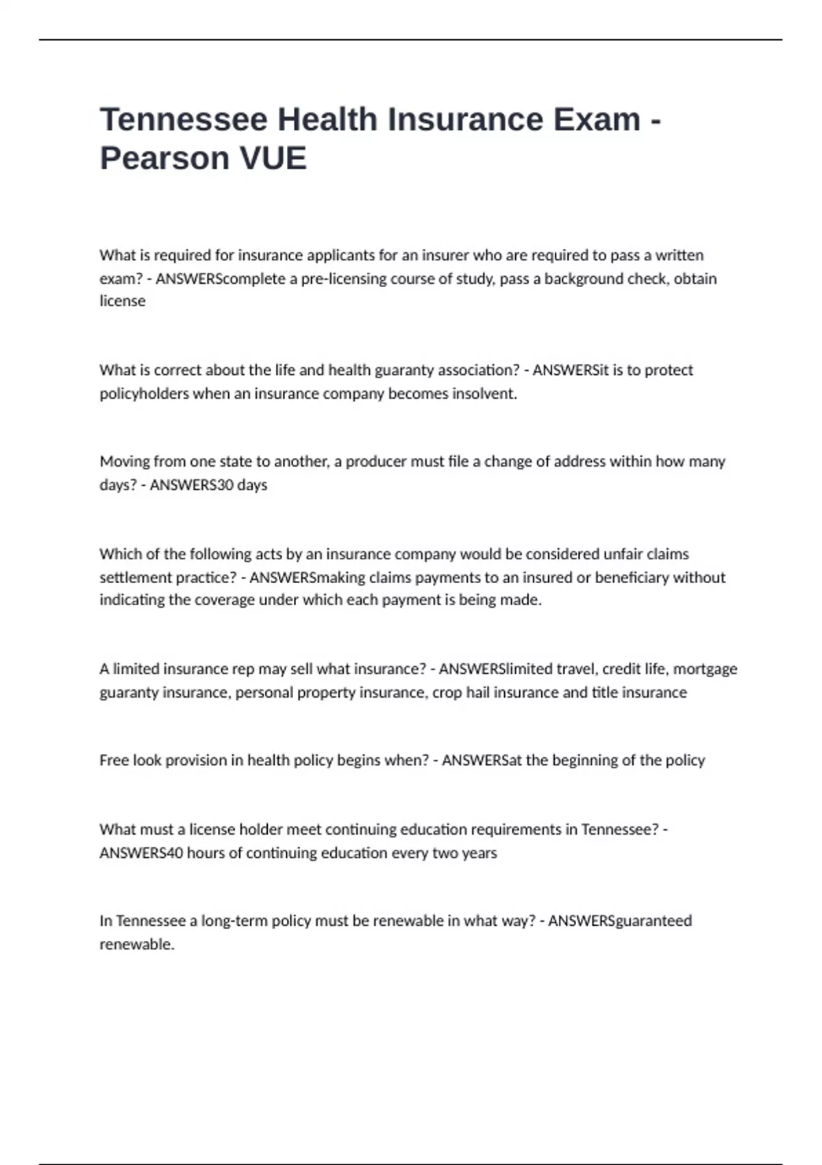 Tennessee Health Insurance Exam - Pearson VUE What is required for insurance applicants for an insurer who are required to pass a written exam? - ANSWERScomplete a pre-licensing course of study, pass a background check, obtain license What is correct about the life and health guaranty association? - ANSWERSit is to protect policyholders when an insurance company becomes insolvent. Moving from one state to another, a producer must file a change of address within how many days? - ANSWERS30 days Which of the following acts by an insurance company would be considered unfair claims settlement practice? - ANSWERSmaking claims payments to an insured or beneficiary without indicating the coverage under which each payment is being made. A limited insurance rep may sell what insurance? - ANSWERSlimited travel, credit life, mortgage guaranty insurance, personal property insurance, crop hail insurance and title insurance Free look provision in health policy begins when? - ANSWERSat the beginning of the policy What must a license holder meet continuing education requirements in Tennessee? - ANSWERS40 hours of continuing education every two years In Tennessee a long-term policy must be renewable in what way? - ANSWERSguaranteed renewable.