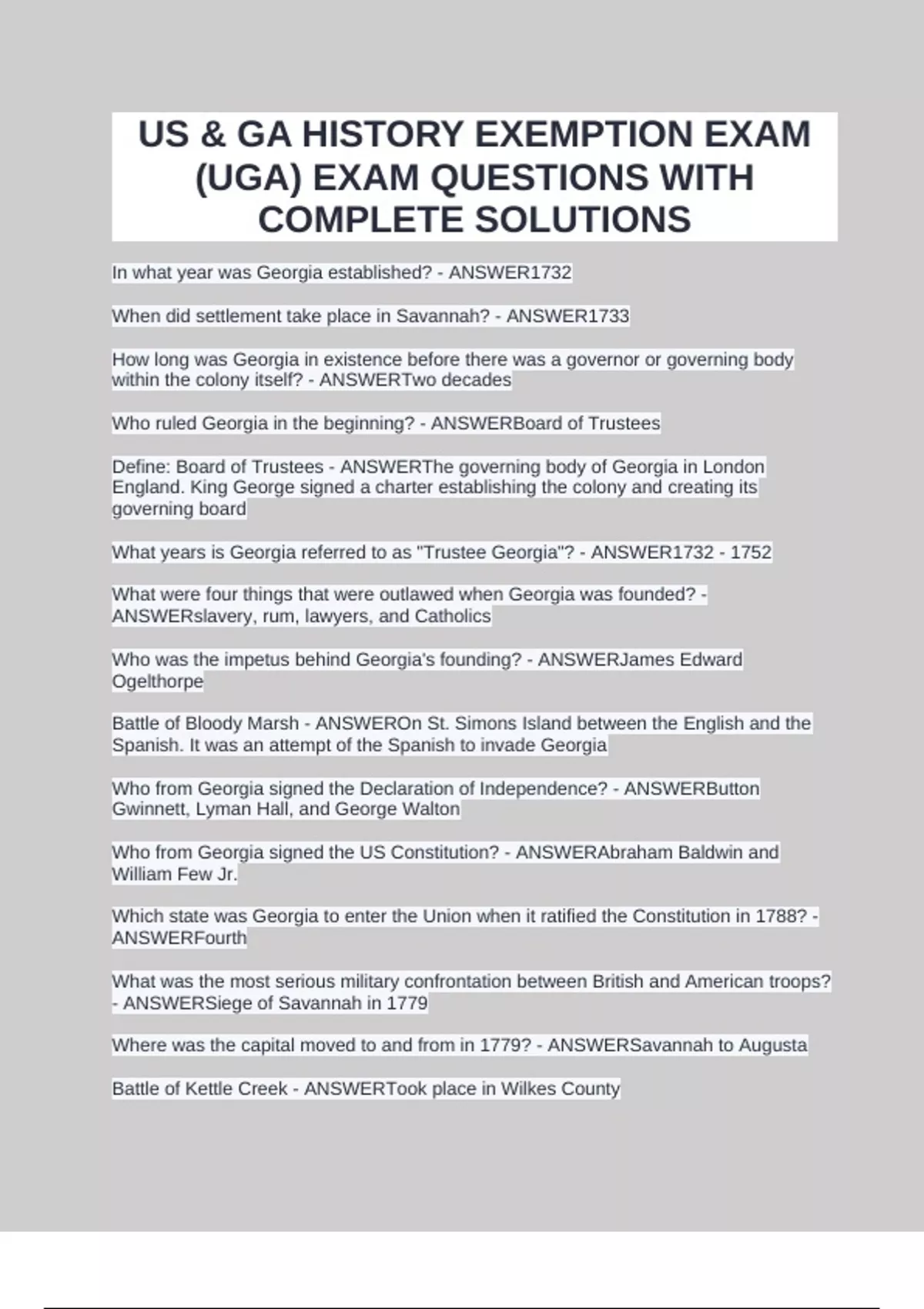 US & GA HISTORY EXEMPTION EXAM (UGA) EXAM QUESTIONS WITH COMPLETE SOLUTIONS