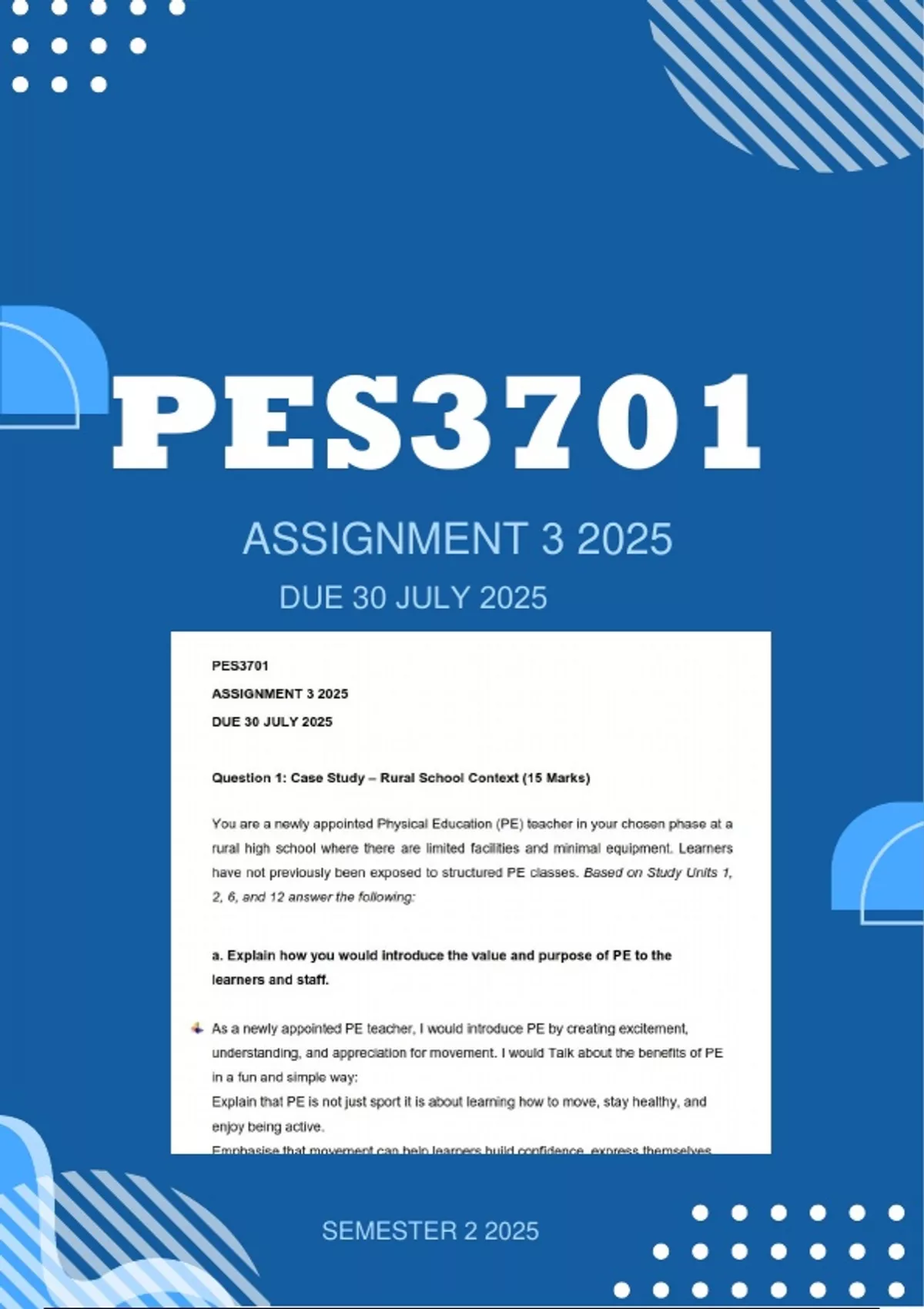PES3701 ASSIGNMENT 3 2025 DUE 30 JULY 2025 Question 1: Case Study – Rural School Context (15 Marks) You are a newly appointed Physical Education (PE) teacher in your chosen phase at a rural high school where there are limited facilities and minimal equipment. Learners have not previously been exposed to structured PE classes. Based on Study Units 1, 2, 6, and 12 answer the following: a. Explain how you would introduce the value and purpose of PE to the learners and staff. As a newly appointed PE teacher, I would introduce PE by creating excitement, understanding, and appreciation for movement. I would Talk about the benefits of PE in a fun and simple way: Explain that PE is not just sport it is about learning how to move, stay healthy, and enjoy being active.