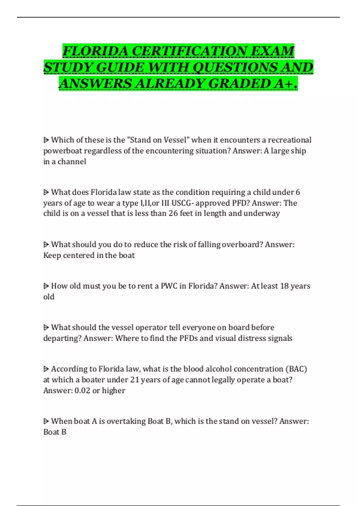 FLORIDA CERTIFICATION EXAM STUDY GUIDE WITH QUESTIONS AND ANSWERS ALREADY GRADED A+.
