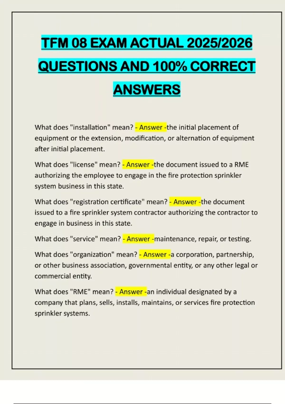 TFM 08 EXAM ACTUAL 2025/2026 QUESTIONS AND 100% CORRECT ANSWERS What does "installation" mean? - Answer -the initial placement of equipment or the extension, modification, or alternation of equipment after initial placement. What does "license" mean? - Answer -the document issued to a RME authorizing the employee to engage in the fire protection sprinkler system business in this state. What does "registration certificate" mean? - Answer -the document issued to a fire sprinkler system contractor authorizing the contractor to engage in business in this state. What does "service" mean? - Answer -maintenance, repair, or testing. What does "organization" mean? - Answer -a corporation, partnership, or other business association, governmental entity, or any other legal or commercial entity. What does "RME" mean? - Answer -an individual designated by a company that plans, sells, installs, maintains, or services fire protection sprinkler systems.Texas Insurance Code 6003 DOES NOT apply to? - Answer -an employee of the USA, this state, or any political subdivision of this state that acts as a fire protection contractor for the employing governmental entity. T/F? - A municipality or county may not enact an order, ordinance, or rule requiring a fire protection sprinkler system contractor to obtain a registration certificate from the municipality or county? - Answer -TRUE, they can not enact any requirements to obtain certification from a municipality or county, T/F? - A municipality or county can impose a fire protection sprinkler system contractor qualification or financial responsibility requirements other than proof of a registration certificat