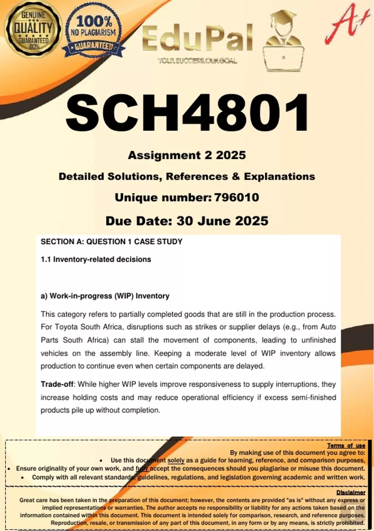 SCH4801 Assignment 2 (COMPLETE ANSWERS) 2025 - DUE 30 June 2025; 100% TRUSTED Complete, trusted solutions and explanations. For assistance, Whats-App 0.6.7-1.7.1-1.7.3.9. Ensure your success with us.. Toyota South Africa's Supply Chain Challenges: A Case Study in Disruption and Resilience Toyota South Africa is a leading automobile manufacturer in the region, with its supply chain serving as a critical part of the company's value chain by ensuring vehicles are produced to the highest quality standards based on incoming orders. This supply chain involves sourcing raw materials and top-notch quality components from global (Japan, North America, Europe and Asia) and local suppliers, assembling vehicles, storing them in warehouses, and distributing them to customers through various logistical channels. Toyota believes in close long-term supplier relationships and yearly hands out awards to suppliers that exceed the performance targets, such as Keiper for their rear seat assembly locks, TAC Manufacturing for their shift lever knobs, Tenneco for exhaust components and Samsung Electronics for the Car Mode App that connecting Samsung smartphones to Toyota radios. Moreover, Toyota focuses on eliminating waste and maintaining high efficiency by applying 'The Toyota Production System' (TPS) as its manufacturing philosophy. TPS enables Toyota South Africa to produce vehicles at a pace aligned with market demand, giving it a competitive advantage over its competitors. However, the complexity of modern supply chains makes them vulnerable to disruptions, which can severely impact operations. Component Shortage Disruption (2019) In 2019, Toyota South Africa faced a significant disruption due to a shortage of key manufacturing components. The issue arose from the company's over-reliance on a single supplier, Auto Parts South Africa (ASA), based in Durban. A large-scale strike by ASA's employees halted the production of essential parts, such as brake pedals, catalytic converters, and fuel tanks, affecting critical models like the Corolla, Fortuner, and Hilux—the latter being the company's best-seller. This resulted in the loss of approximately 6,000 vehicles, as production of 500 vehicles per day stopped, with sales of the Hilux being particularly affected. To address the shortage, Toyota reduced production capacity, temporarily laid off workers, and sought new suppliers. This process required significant resources from the purchasing department and took time, as onboarding new suppliers involved logistical challenges. Impact of Flooding on Operations (2022) In 2022, severe flooding in the KwaZulu-Natal region, particularly in Durban, further disrupted Toyota's operations. Toyota's competitors saw this as an opportunity to enhance their market share, as various Toyota customers, such as Hertz, Avis (rental companies), Toyota dealers, commercial fleet organisations and government entities might need to wait for their special orders. The Prospecton plant suffered extensive damage, with approximately 88% of the vehicles on-site destroyed and production lines SCH4801 ASSIGNMENT 2 2025 Page 8 of 15 severely impacted. Beyond the plant, the floods disrupted the movement of automotive parts and finished vehicles, as the port of Durban, a key logistical hub, experienced delays due to congestion. Toyota reported losses of about 45,000 vehicles, with many new cars rendered unusable due to flood damage. Although port operations resumed quickly, supply chain delays persisted, affecting import and export schedules. Climate change impact Climate change has a major impact on the environment, which leads to unpredictable weather patterns such as flooding. Organisations need to consider their environmental impact and find ways to reduce greenhouse gases. Environmental issues are becoming increasingly important to Toyota. Therefore, Toyota expects its suppliers to be ISO 14001 compliant. Being ISO 14001 compliant requires that suppliers adhere to specific predetermined standards to manage their impact on the environment, mainly caused by the materials they use, the production processes they deploy, and the waste, scrap, packaging, and disposal of the end product. Toyota communicates its global requirements for producing clean and safe products to its suppliers, among others, through its “Green Purchasing Guidelines”. In addition to the “Green Purchasing Guidelines”, Toyota provides suppliers with a list of substances they should avoid using in their production process. The way forward The impact of climate change and the disruptions highlighted are critical vulnerabilities in Toyota South Africa's supply chain, such as the importance of effective communication and collaboration with suppliers. According to Toyota's CEO, "The decision we take over the next three to four years is going to affect what the future manufacturing footprint looks like in SA, its economic value, jobs, skills creation and the profile of vehicles sold". He also mentioned that the industry needs to consider where vehicles will be sourced from and the mix of imports versus locally produced vehicles. Therefore, Toyota South Africa needs to prepare for future uncertainties that can safeguard its operations and remain competitive. SECTION A: QUESTION 1 QUESTIONS 31 MARKS Section A (question 1) consists of short essay-type questions. Please note that the questions are based on the case study – Toyota South Africa's Supply Chain Challenges: A Case Study in Disruption and Resilience. Please use the underlined words for each of your report's three (3) questions as sub-headings. Also, number your answers, for example, 1.1, 1.2, up to 1.3. Also, remember to link your answer to Toyota South Africa's Supply Chain Challenges: A Case Study in Disruption and Resilience. Very important: When referring to Toyota, please note that you cannot just provide the sentences from the case study. Your answers should not contain replication from the case study but ra
