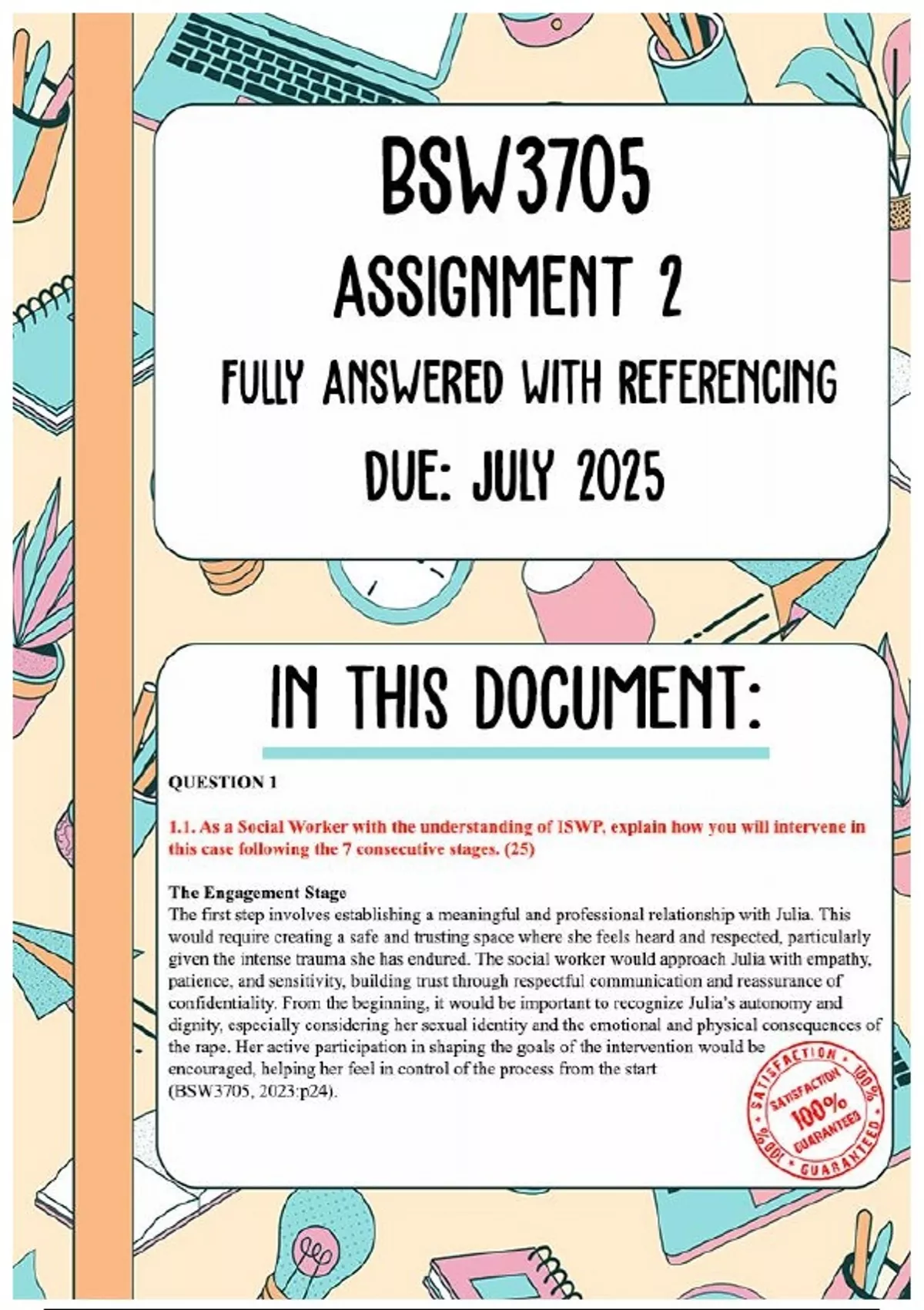 BSW3705 Assignment 2 Memo | Due July 2025. This document contains a fully answered assignment with complete answers to all questions and tasks. Every section is carefully completed to ensure a guaranteed pass. Perfect for guaranteed pass, high marks, and peace of mind.