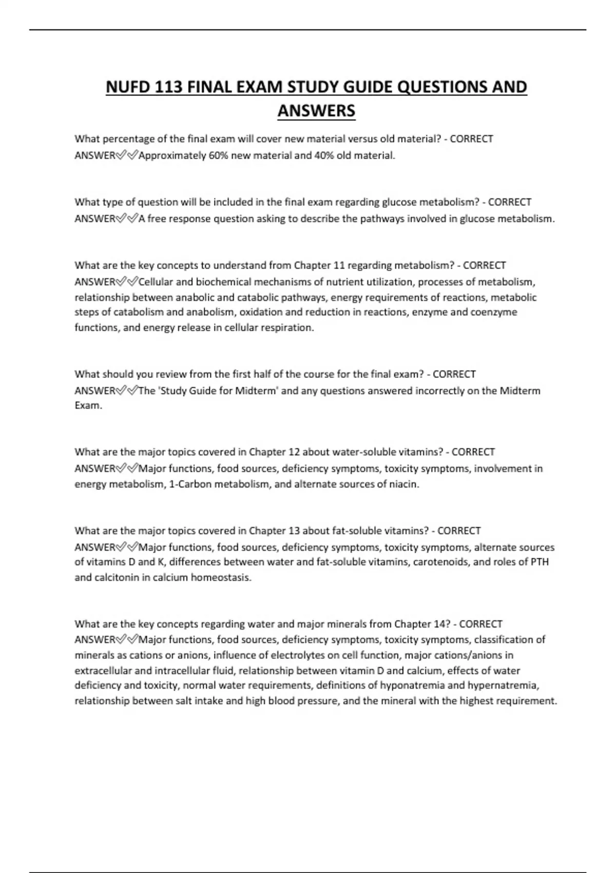 NUFD 113 FINAL EXAM STUDY GUIDE QUESTIONS AND ANSWERS What percentage of the final exam will cover new material versus old material? - CORRECT ANSWERApproximately 60% new material and 40% old material.