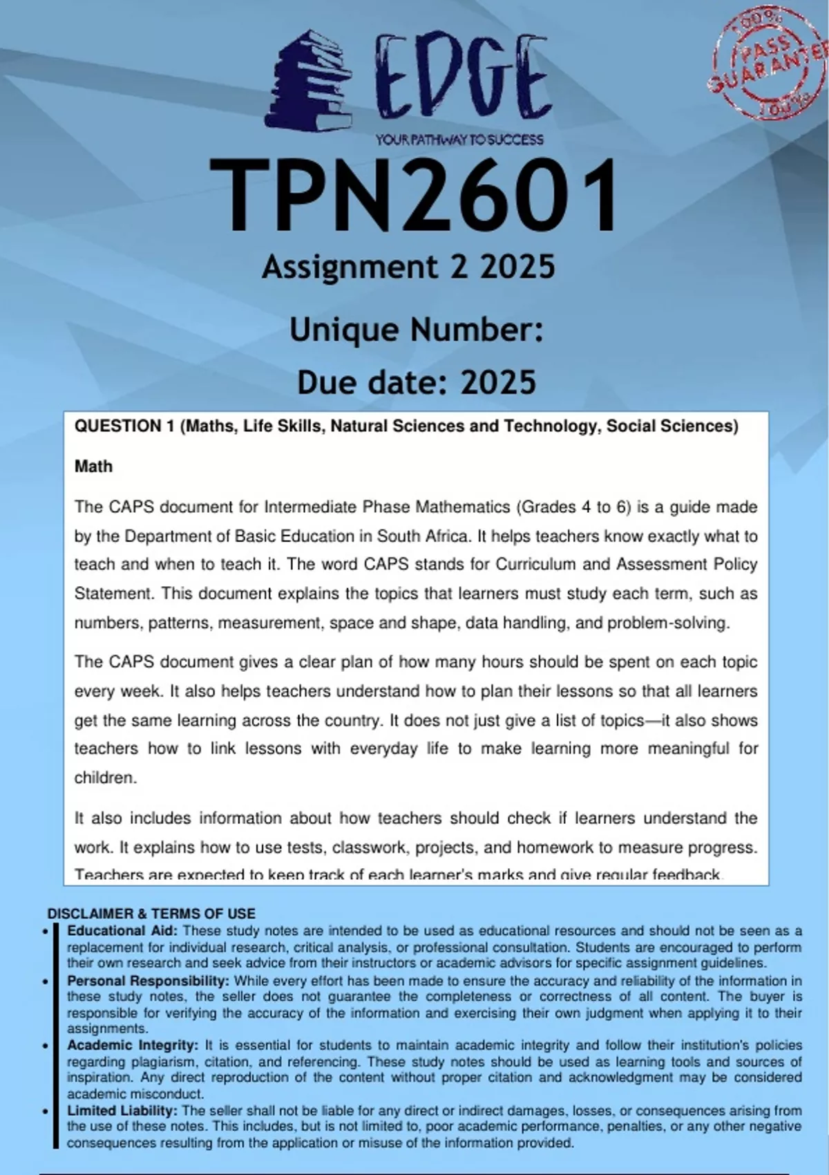 TPN2601 Assignment 3 (DETAILED ANSWERS) 2025 - DISTINCTION GUARANTEED - DISTINCTION GUARANTEED - DISTINCTION GUARANTEED Answers, guidelines, workings and references ,... 1. In your own words, explain what the main information in the CAPS document is about. …………………………………………………………………………………………………………………………………………………………………………………………………………………………………………………………………………………………………………………………………………………………………………………………………………………………………………………………………………………………………………………………………………………………………………………………………………………………………………………………………………………………………………………………………………………………………………………………………………………………………………………………………………………………………………………………………………………………………………………………………………………………………………………………………………………………………………. (8) 2. Read the section on the general aims of the South African Curriculum and summarise the aspects listed under this heading. ………………………………………………………………………………………………………………………………………………………………………………………………………………………………………………………………………………………………………………………………………………………………………………………………………………………………………………………………………………………………………………………………………………………………………………………………………………………………………………………………………………………………………………………………………………………………………………………………………………………………………………………………………………………………………….(8) 3. Time allocation is a valuable guide when planning your teaching. Read the information on time allocation for your phase and the section on time allocation for one of the specific teaching subjects that you are registered for. Draw a grid to plan the allocated time for your subject in one calendar week. ………………………………………………………………………………………………………………………………………………………………………………………………………………………………………………………………………………………………………………………………………………………………………………………………………………………………………………………………………………………………………………………………………………………………………………………………………………………………………………………………………………………………………………………………………………………………………………………………………………………………………………………………………………………………………………………………………………………………………………………………………………………………………………………………………………………………………………………………………………………………………………………………………………………………………………………………………………………………………. (10) 4. Read the first topic in the Annual Teaching Plan or the syllabus for your subject and list the knowledge, skills and values that learners should have after completing this topic. …………………………………………………………………………………………………………………………………………………………………………………………………………………………………………………………………………………………………………………………………………………………………………………………………………………………………………………………………………………………………………………………………………………………………………………………………………………………………………………………………………………………………………………………………………………………………………………………………………………………………………………………………………………………………………………………………………………………………………………………………………………………………………………………………………………………………………………………………………………………………………………………………………………………………………………………. (12) 5. List the content topics of the subject in the first and second term. ………………………………………………………………