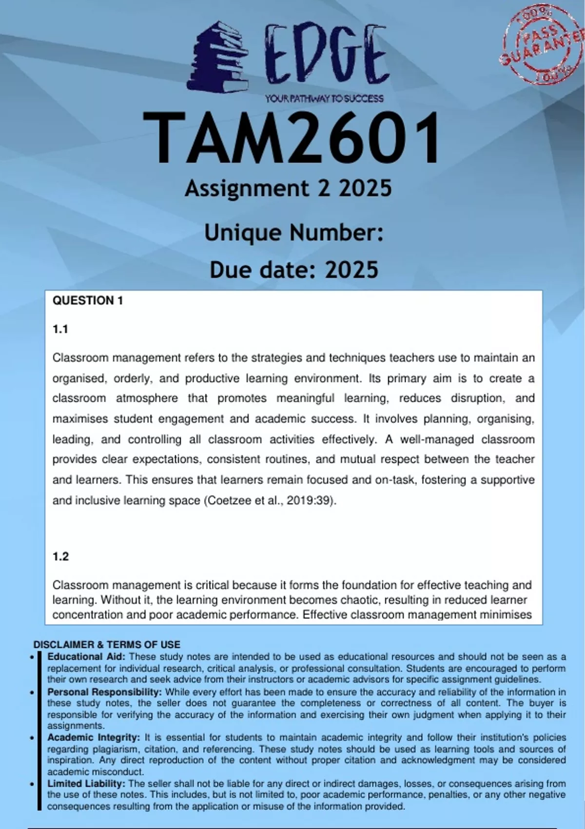 TAM2601 Assignment 2 (DETAILED ANSWERS) 2025 - DISTINCTION GUARANTEED - DISTINCTION GUARANTEED - DISTINCTION GUARANTEED Answers, guidelines, workings and references ,... QUESTION 1 Read the abstract below and answer the questions that follow: The nature and aim of classroom management Classroom management is a critical component of effective teaching and learning. It encompasses teachers' strategies, practices, and techniques to create and maintain an orderly learning environment. The primary aim of classroom management is to foster a positive and productive classroom atmosphere where students can engage in meaningful learning experiences. Effective classroom management involves establishing clear expectations, consistent routines, and respectful relationships. It aims to minimize disruptive behaviors and maximize student engagement by promoting a sense of safety, respect, and responsibility among students. Teachers employ various approaches to classroom management, including proactive strategies to prevent misbehavior, reactive strategies to address issues as they arise, and supportive strategies to encourage positive behavior. The nature of classroom management is dynamic and multifaceted, requiring teachers to be adaptable and responsive to the diverse needs of their students. It balances authority and empathy, structure and flexibility, and discipline and encouragement. By effectively managing their classrooms, teachers can create an environment conducive to learning, where students feel valued, motivated, and empowered to achieve their full potential. 1.1 What is classroom management, and what should its primary aim be? (2) 1.2 Why is classroom management critical to effective teaching and learning? (2) 1.3 Discuss two approaches to classroom management that teachers use to encourage positive behavior. (2) 1.4 Classroom management can be challenging for teachers due to various factors. Discuss two of these factors and provide solutions for them. (4) [10] 2 QUESTION 2 Analyse how understanding the Millennial Generation and self-management for educators enhance classroom management. In your answer, discuss strategies for engaging today’s learners, addressing the digital divide, and managing emotions, stress, and anger to promote fair discipline and inclusivity. Provide practical example [10] QUESTION 3 3.1 Give one practical example wherein you have applied /experienced application of each of the following classroom management tasks: planning, organizing, leadership, and control. (8) 3.2 Can you share a strategy you are using /have experienced to keep up with the demands of today’s learners (2) [10] QUESTION 4 Critically discuss any four aspects required to create a positive classroom environment that enables effective teaching and learning. Provide one example to illustrate your answer. [10] QUESTION 5 Critically analyse the role of parental involvement and effective classroom administration in enhancing learner performance. In your response, discuss strategies teachers can implement to actively engage parents and efficiently manage administrative tasks to create a conducive learning environment. Support your argument with relevant examples. [10]