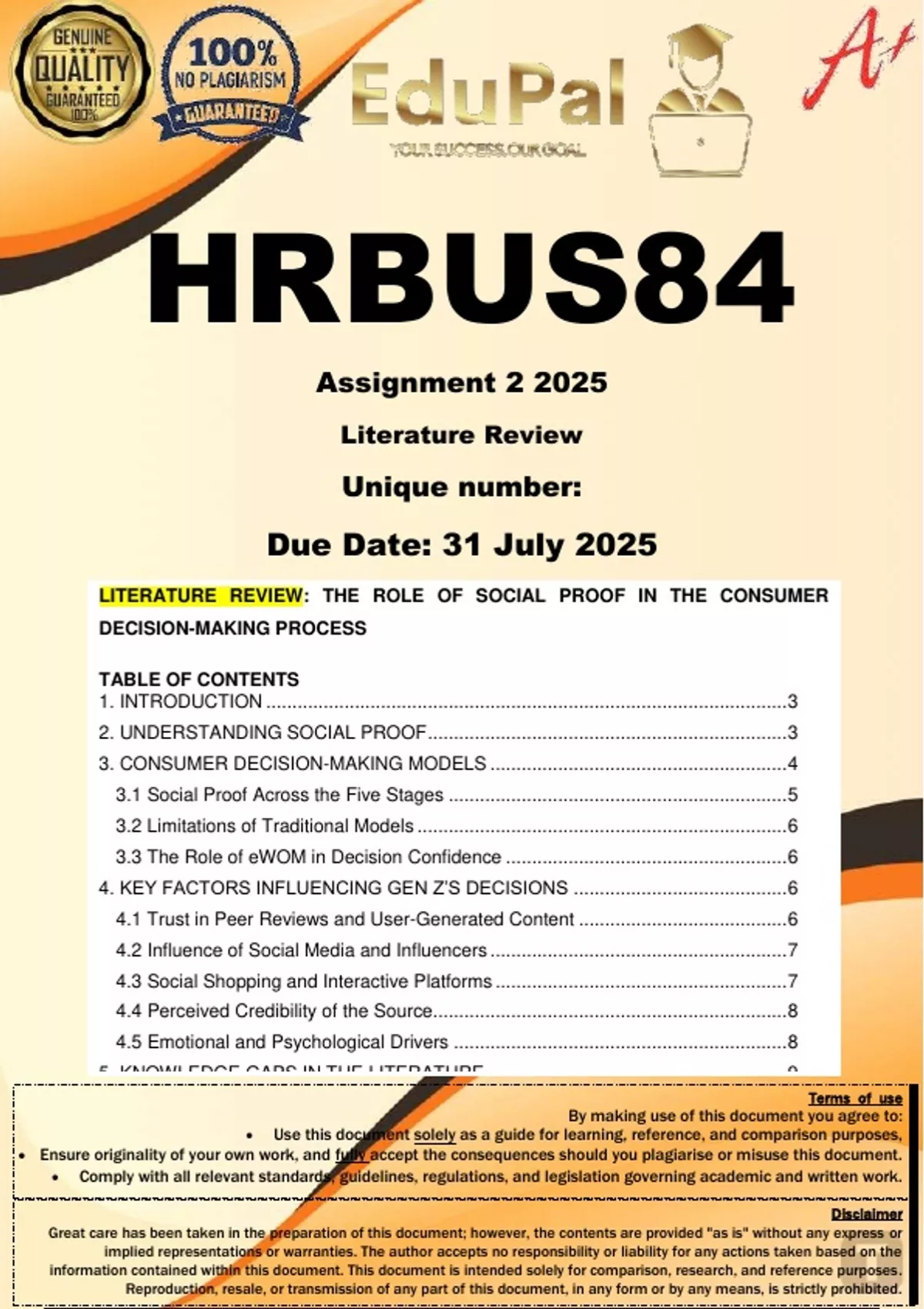 HRBUS84 Assignment 2 (LITERATURE REVIEW) 2025 - DUE 31 July 2025; 100% TRUSTED Complete, trusted solutions and explanations. For assistance, Whats-App 0.6.7-1.7.1-1.7.3.9. Ensure your success with us. ... The role of social proof on the consumer decision- making process