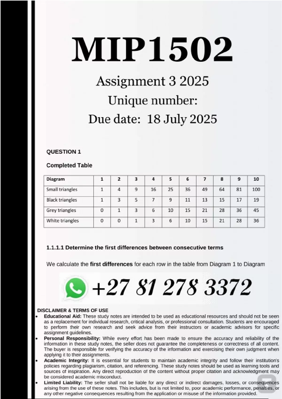 MIP1502 Assignment 3 (100% ANSWERS) 2025 - DUE 18 July 2025 ..................Question 1 1.1 The diagram below shows small, black, grey and white triangles forming a pattern. The table below shows the number of triangles in each diagram. Diagram 1 2 3 4 5 6 7 8 9 10 Small triangles 1 4 9 16 25 36 Black triangle 1 3 5 7 9 11 Grey triangles 0 1 3 6 10 White triangles 0 0 1 3 6 10 1.1.1 Analyse the four patterns presented in the table (Small triangles, Black triangles, Grey triangles, and White triangles). 1.1.1.1 For each pattern, determine the first differences between consecutive terms. (1) 1.1.1.2 Based on the differences, classify each pattern as either linear or quadratic. (1) 1.1.1.3 Provide a mathematical justification for your classification of the 'Small triangles' and 'Black triangles' patterns, referencing the concept of a 'constant difference' as a key feature of linear sequences. (2) 1.1.2 The CAPS document emphasises representing patterns in various equivalent forms. For the Grey and White triangle patterns: 1.1.2.1 Describe in words how each pattern grows from one diagram to the next. (2) 1.1.2.2 Design two separate flow diagrams that model the process of finding the number of triangles (output) for any given diagram number (input,