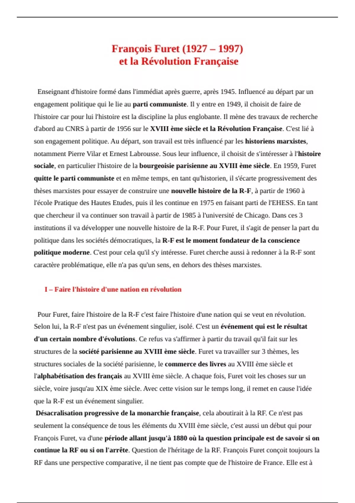 Pour Furet, faire l'histoire de la R-F c'est faire l'histoire d'une nation qui se veut en révolution.