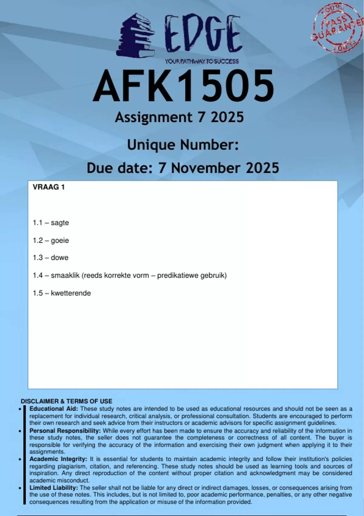 Well-structured AFK1505 Assignment 7 (ANSWERS) 2025 - DISTINCTION GUARANTEED. (DETAILED ANSWERS - DISTINCTION GUARANTEED!)...
